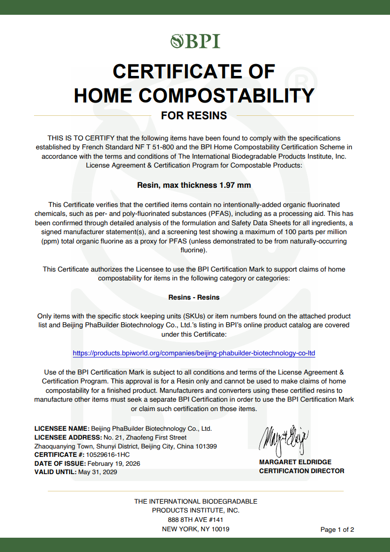 日前,国际生物降解产品协会(BPI)经严格检测与审核后,为顺义企业——北京微构工场生物技术有限公司颁发了全球首张PHA原料家庭堆肥认证证书。这标志着微构工场实现了从技术可行到获得国际权威认证的关键一步。