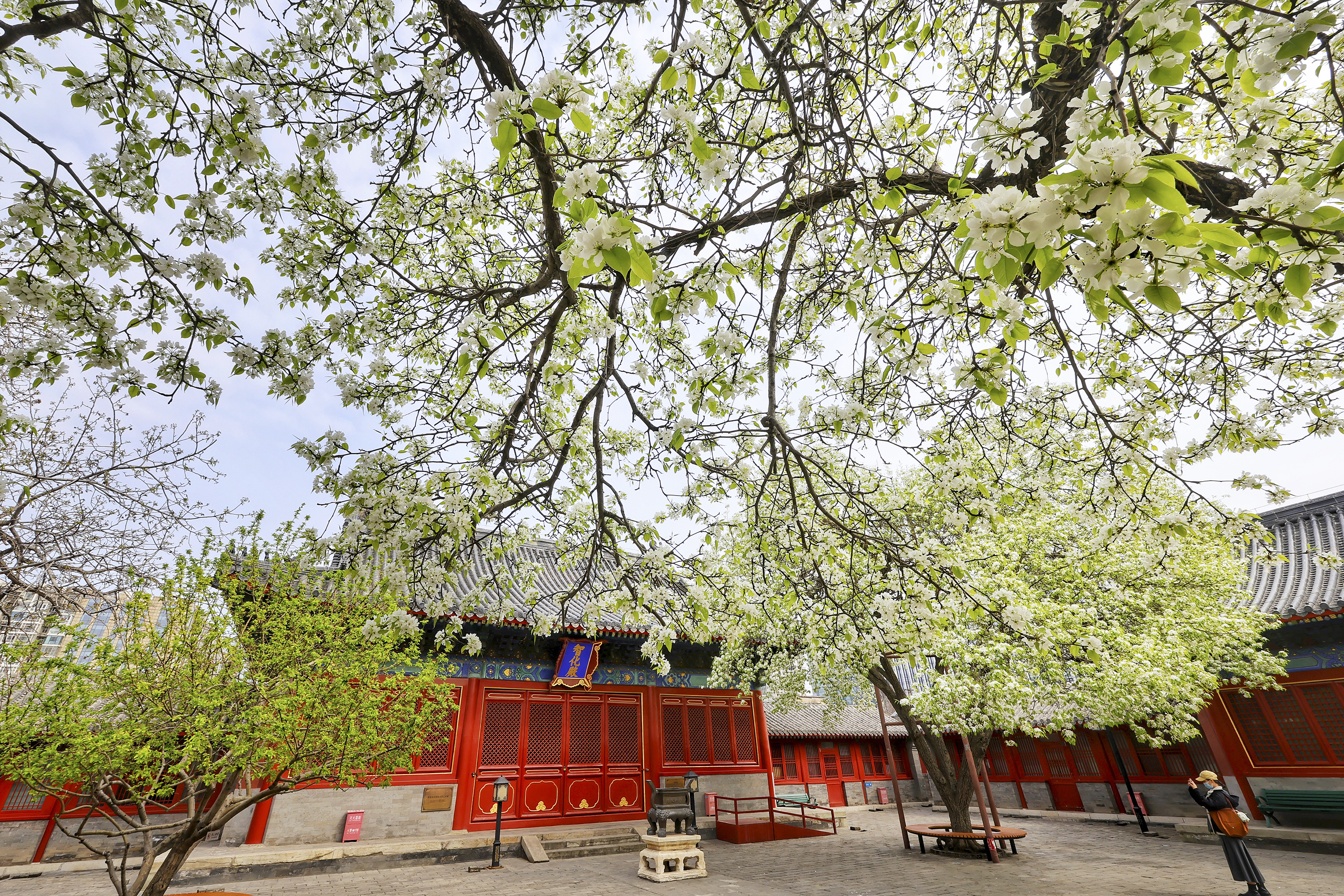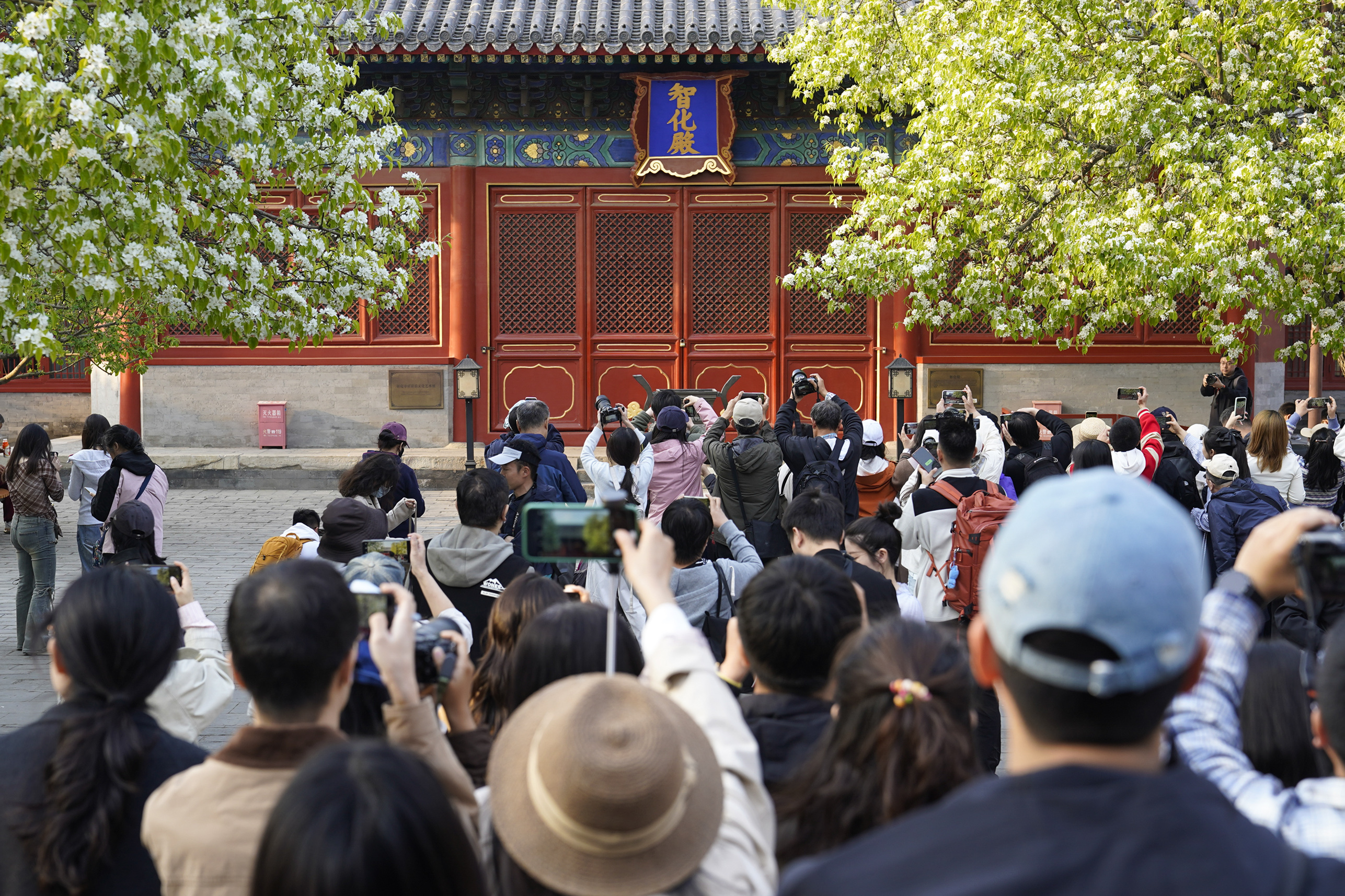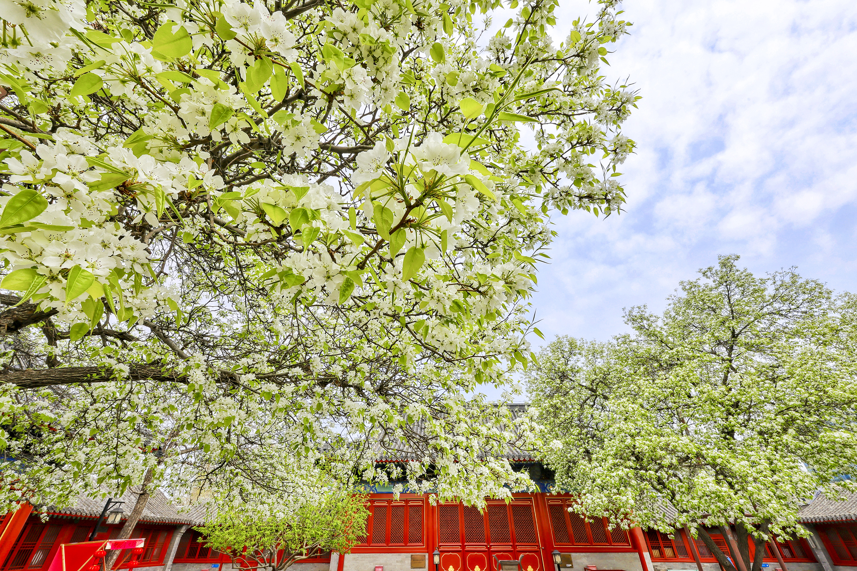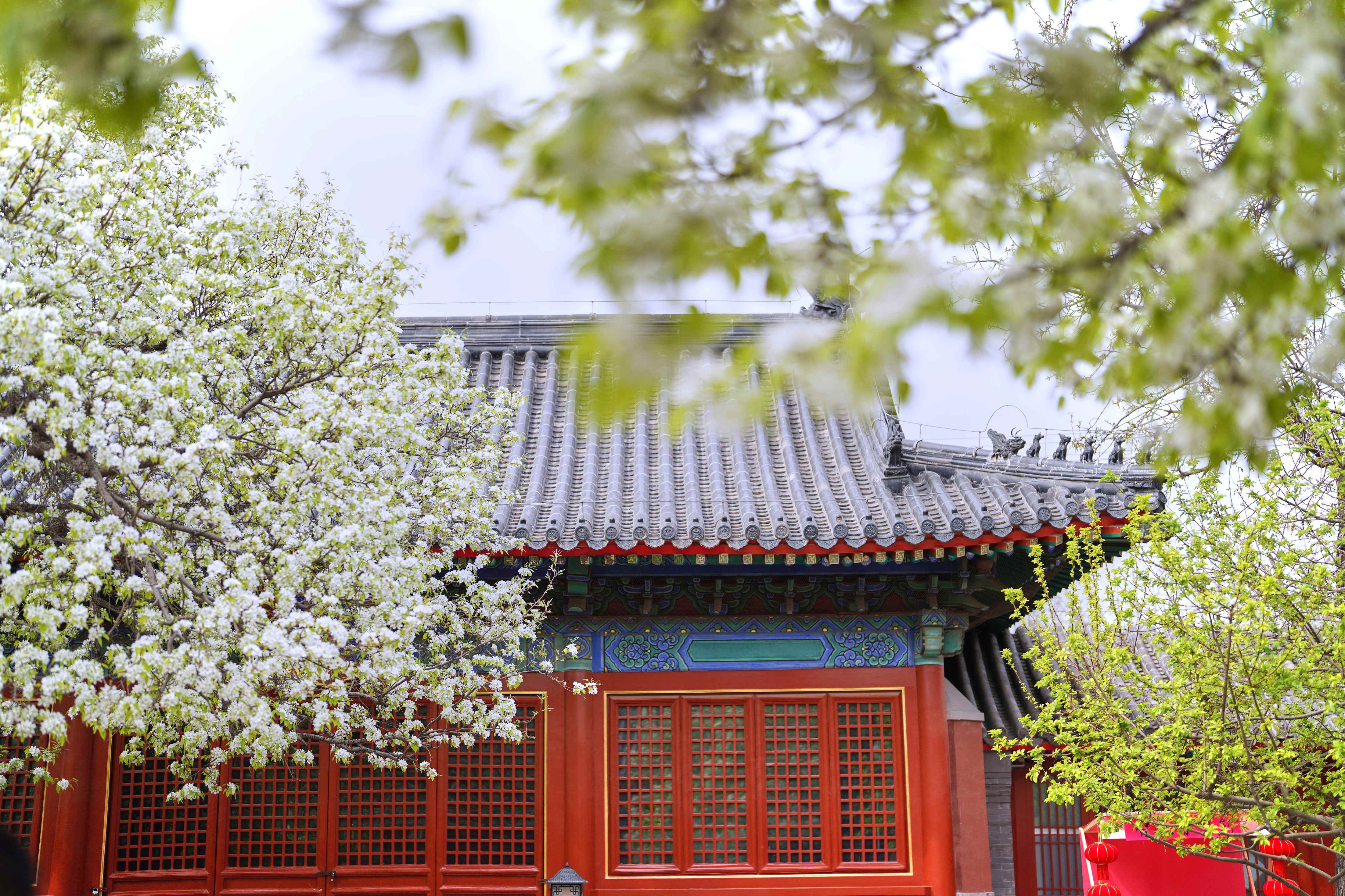 春回大地,胡同深处,智化寺迎来一年一度的春日盛景。这座保存完好的明代木结构古刹内,两株古梨树繁花满枝,雪白花瓣如云似瀑,与红墙黑瓦相映成趣,勾勒出独属于京城的诗意春光。