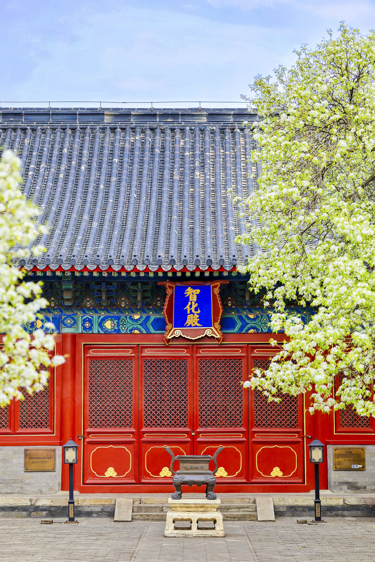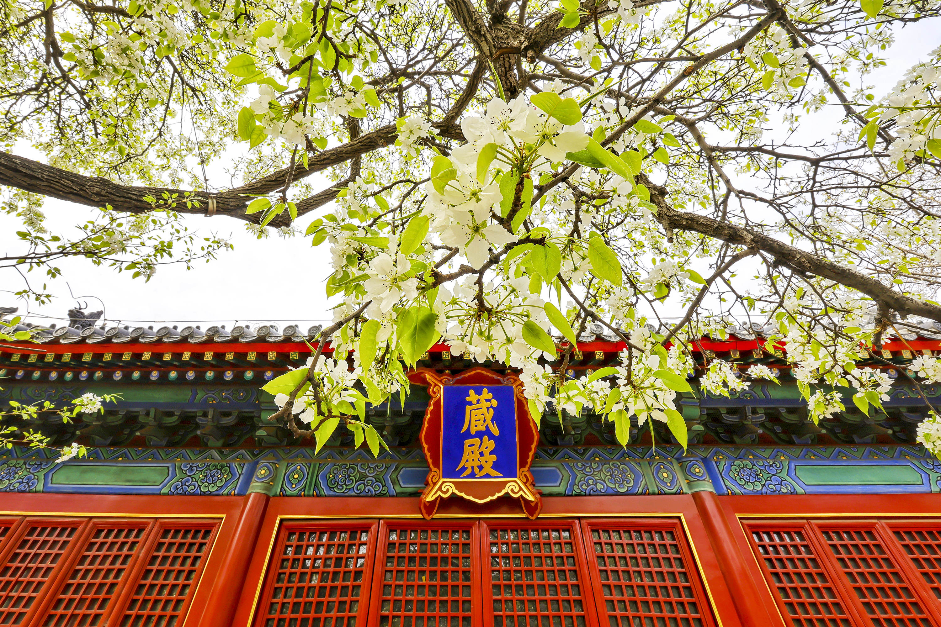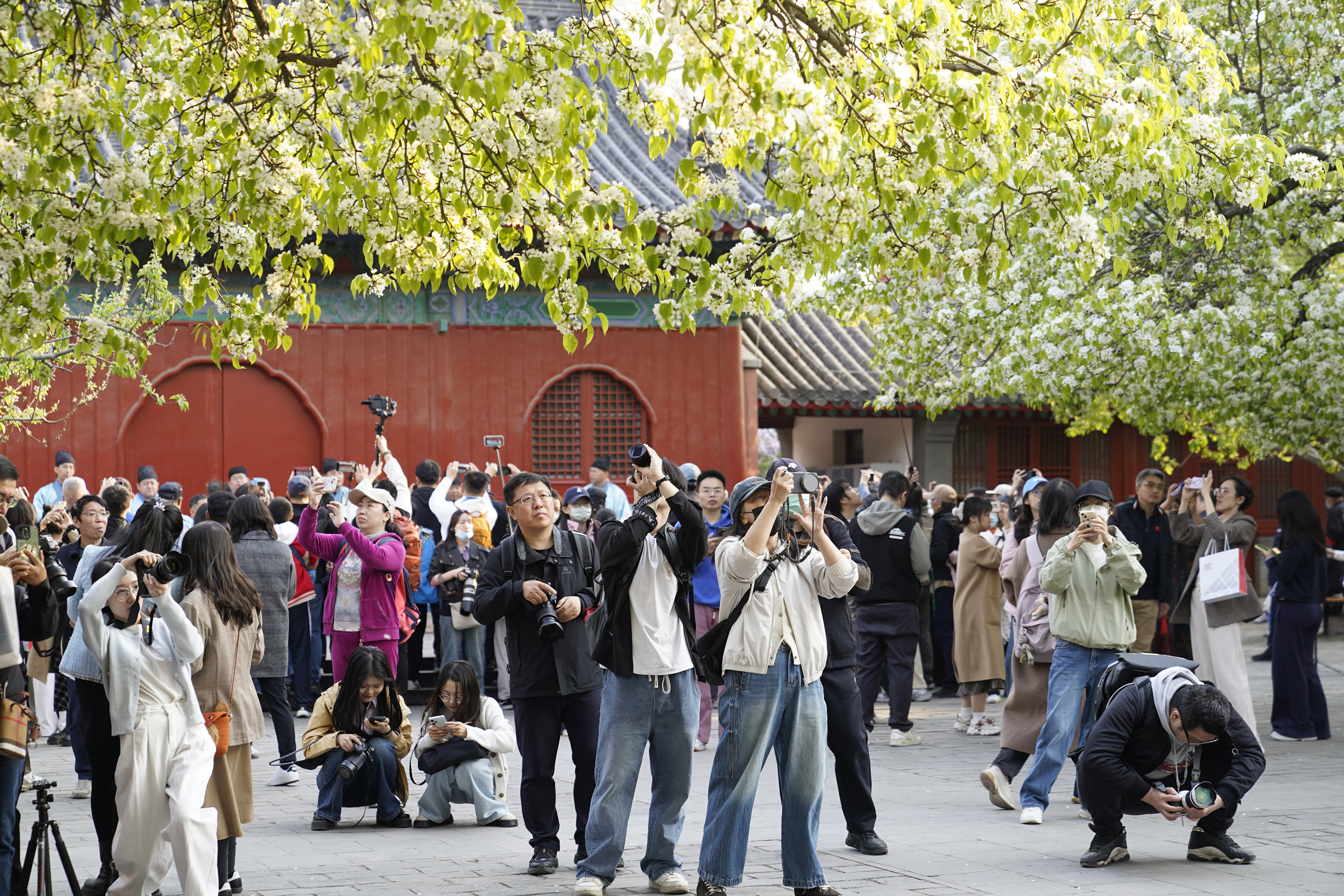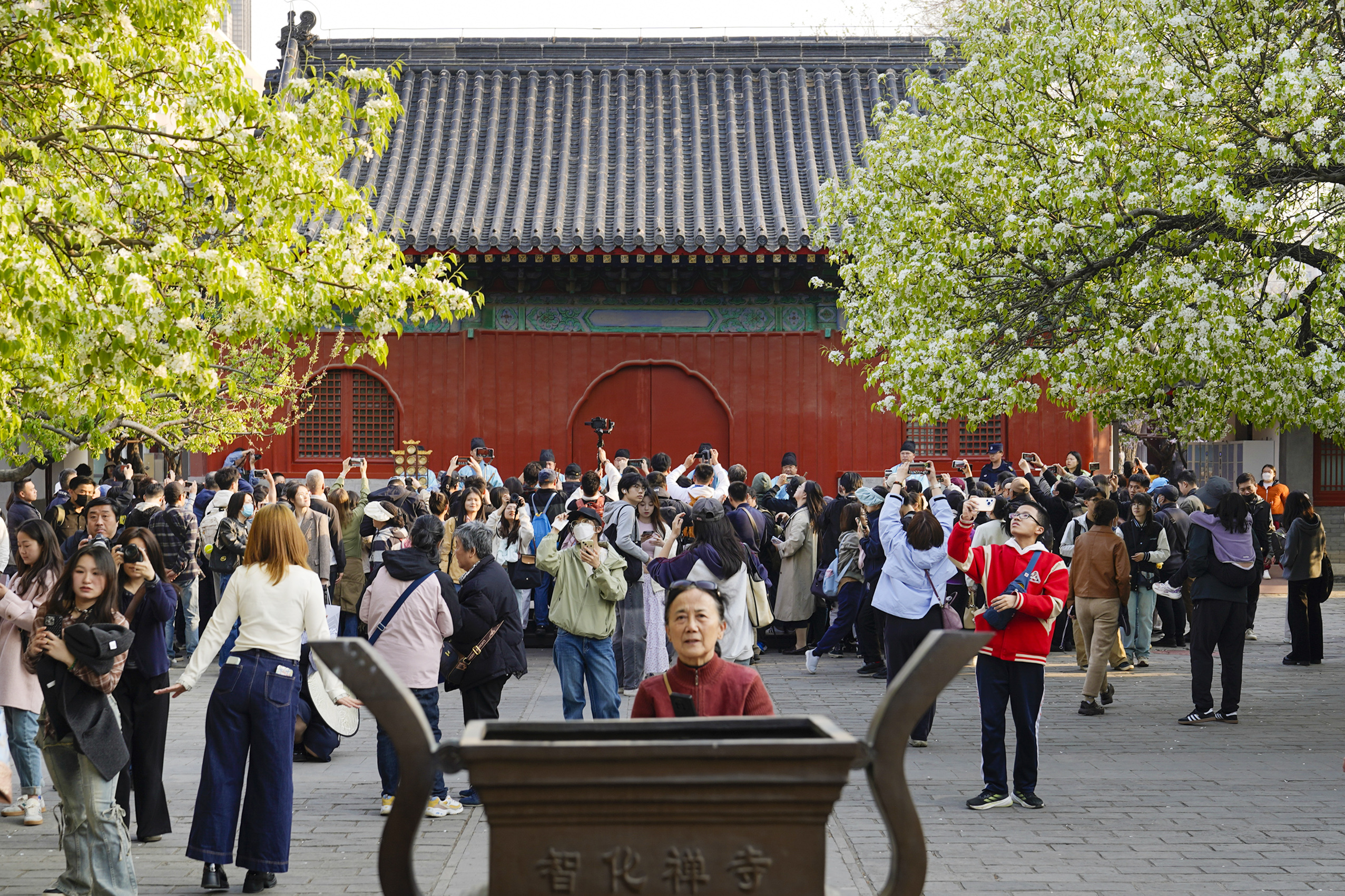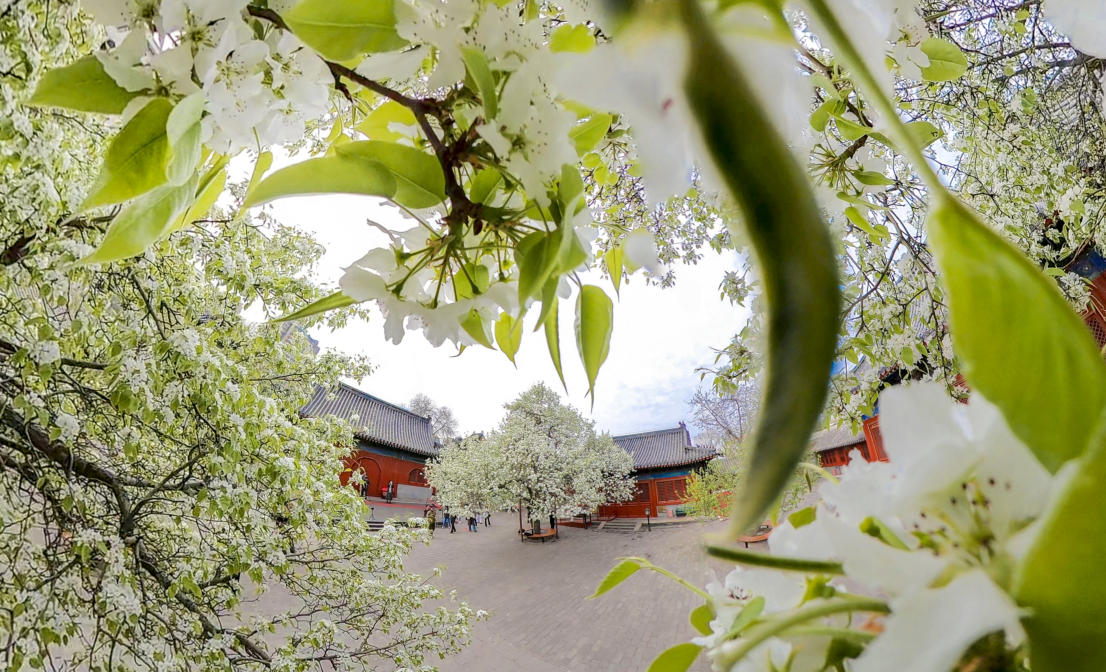 春回大地,胡同深处,智化寺迎来一年一度的春日盛景。这座保存完好的明代木结构古刹内,两株古梨树繁花满枝,雪白花瓣如云似瀑,与红墙黑瓦相映成趣,勾勒出独属于京城的诗意春光。
