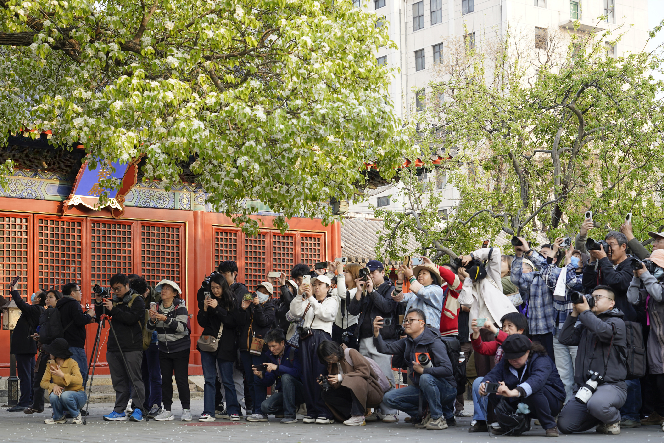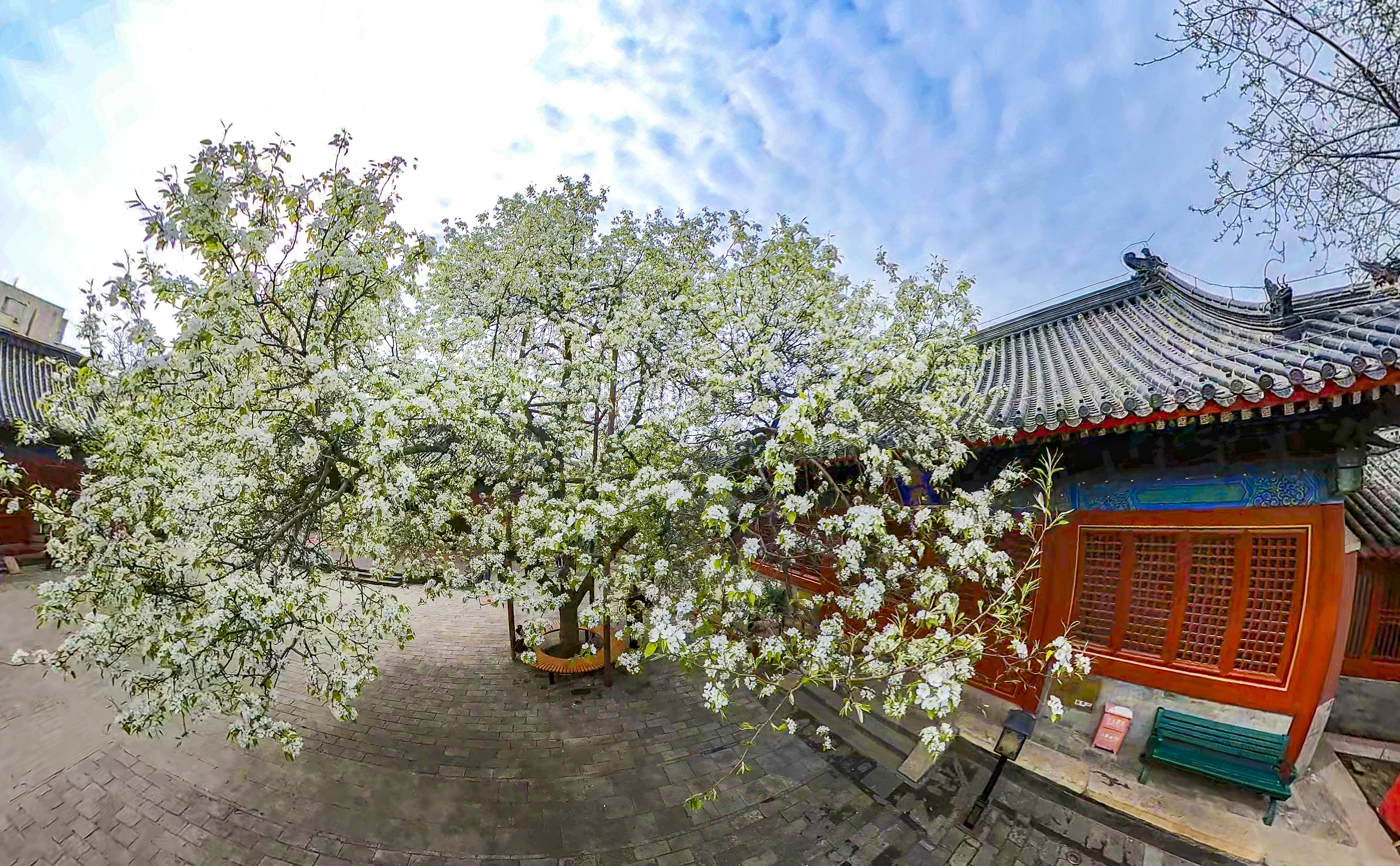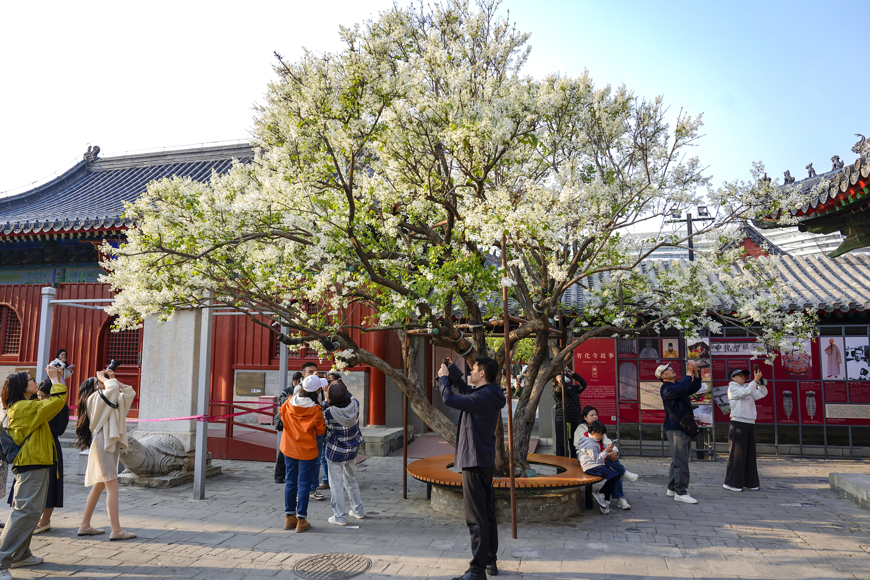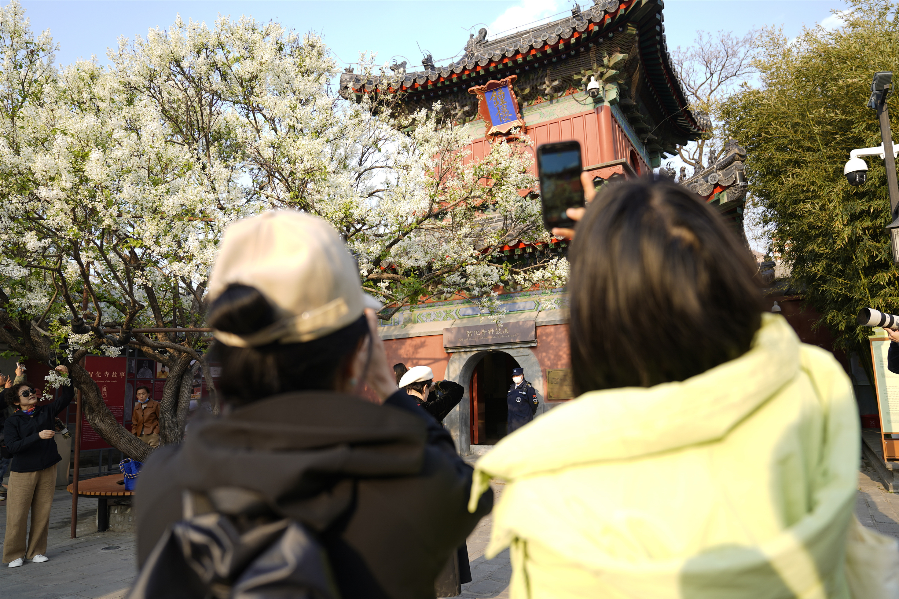 春回大地,胡同深处,智化寺迎来一年一度的春日盛景。这座保存完好的明代木结构古刹内,两株古梨树繁花满枝,雪白花瓣如云似瀑,与红墙黑瓦相映成趣,勾勒出独属于京城的诗意春光。
