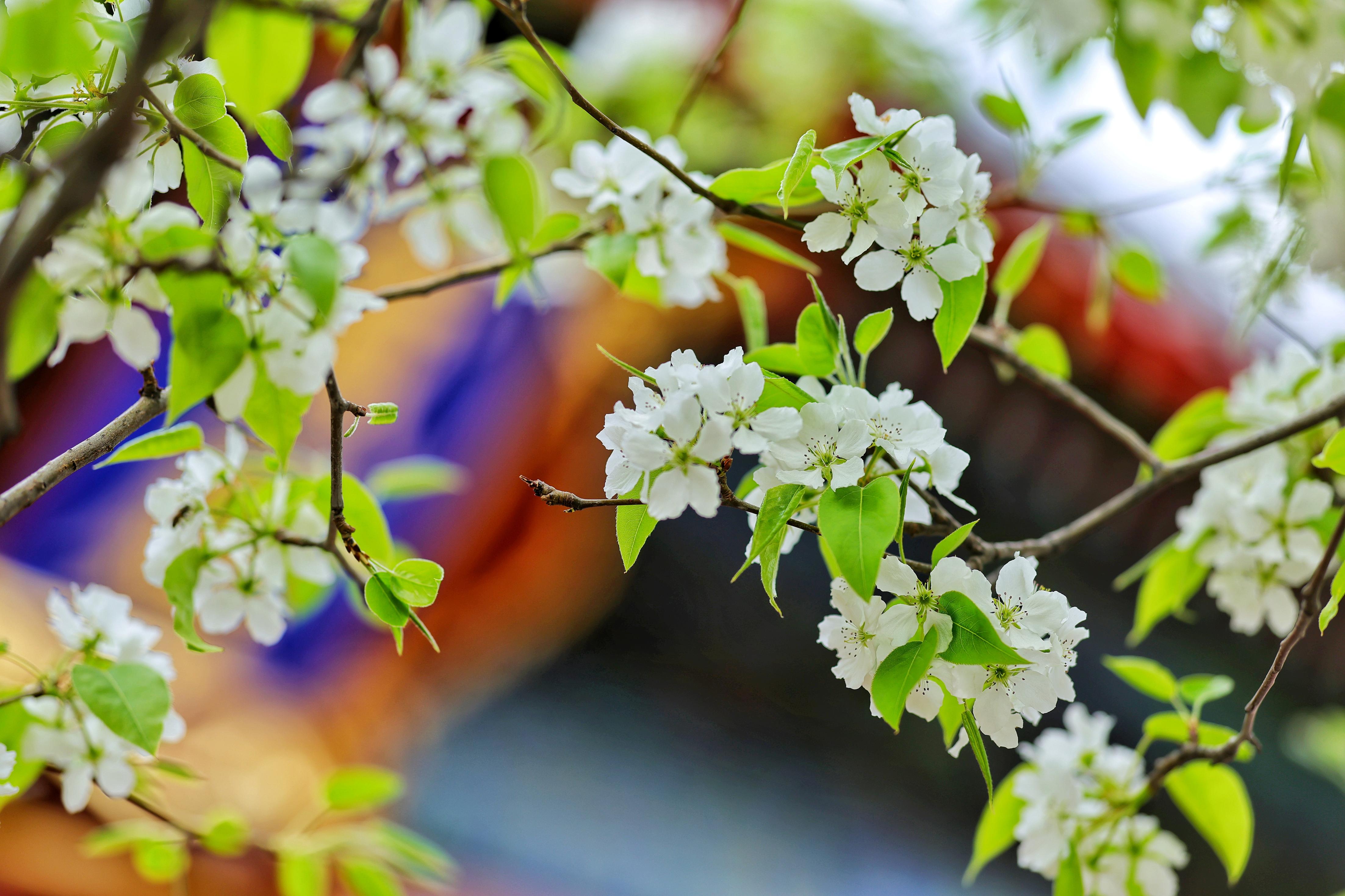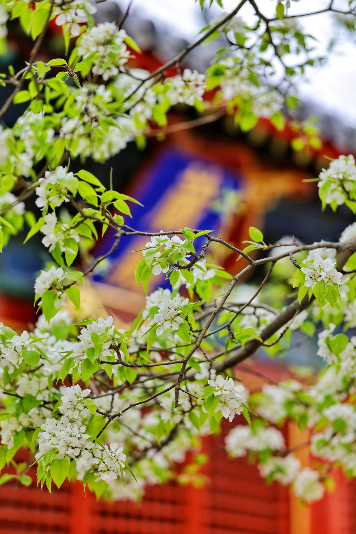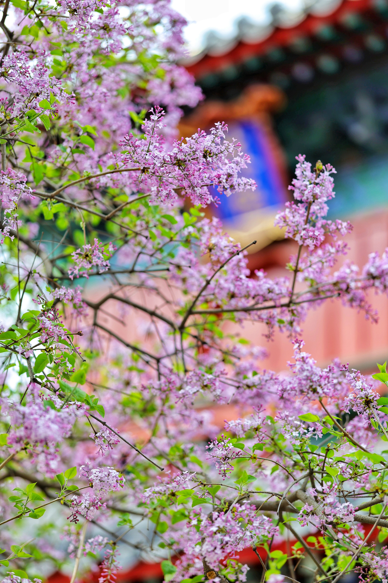 寺中的白丁香与紫丁香也已悄然绽放,一簇簇莹白、淡紫缀满枝头,与梨花相映成画,芬芳沁人。