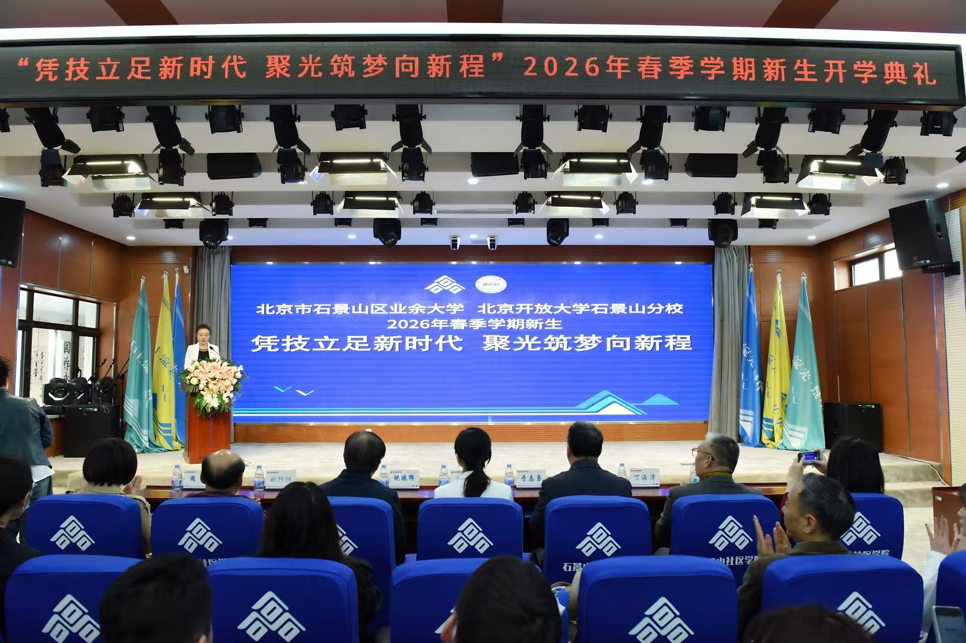 春意盎然,万物竞发。3月28日上午,北京市石景山区业余大学、北京开放大学石景山分校隆重举行“凭技立足新时代 聚光筑梦向新程”2026年春季学期新生开学典礼。北京市教委、北京开放大学、合作企业及学校领导出席,与新生共同见证。典礼在庄严的国歌声中拉开帷幕。副校长刘荣主持典礼。