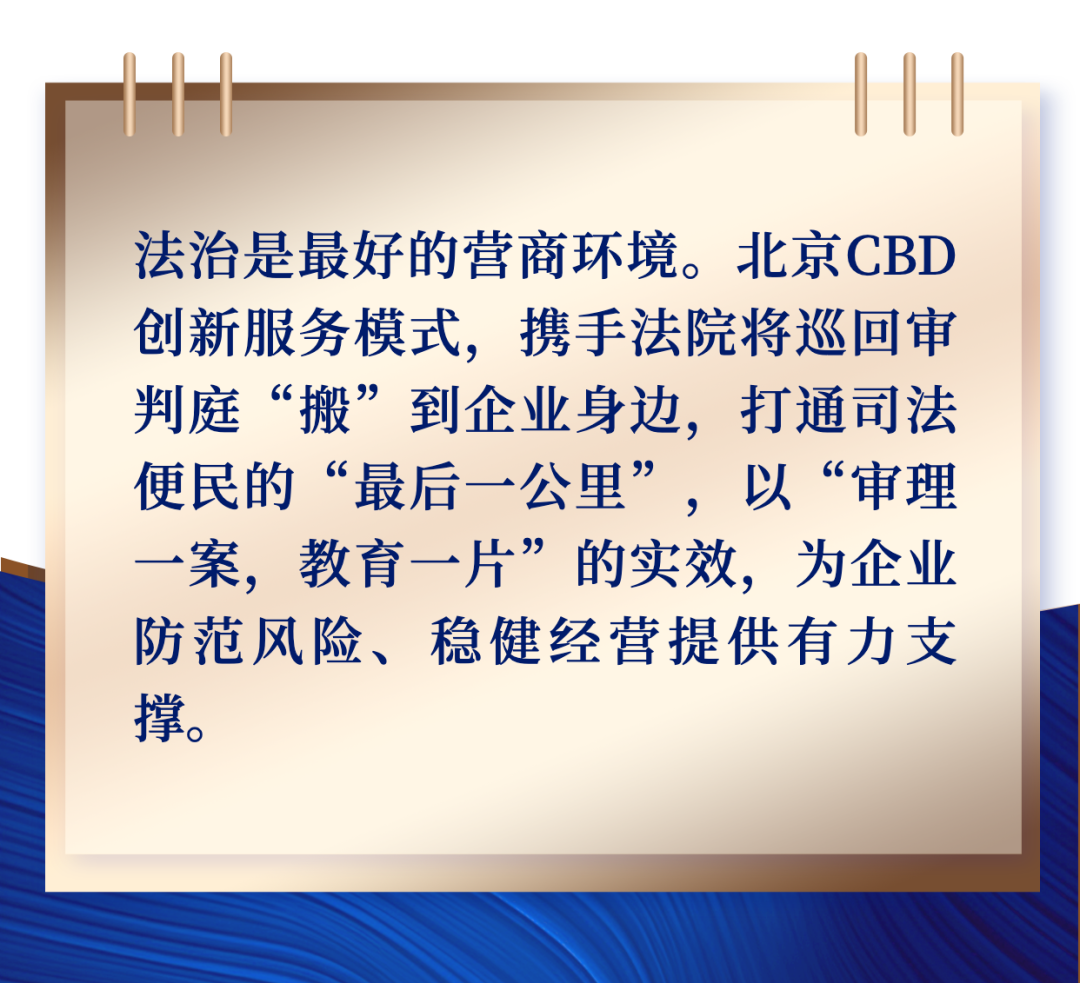 下一步,北京商务中心区管理委员会将继续深化与北京一中院、北京三中院、北京四中院、北京金融法院、北京互联网法院、北京知识产权法院、朝阳法院等合作共建,持续推动巡回审判机制的常态化、精品化,进一步聚焦示范区企业的司法需求,建立多维服务矩阵,为充分释放北京国际法商融合示范区的引领带动作用提供更加精准有力的司法保障。