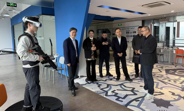 考察过程中,吕伟刚一行深入体验了研究院核心产品,包括元宇宙展厅、XR大空间沉浸式体验项目、万向体感平台和自研VR游戏。通过现场互动和实际操作,详细了解了公司概况、相关文旅产品的应用场景和市场前景,并对山外大杭州元宇宙研究院做出的科研成果给予了充分肯定。
