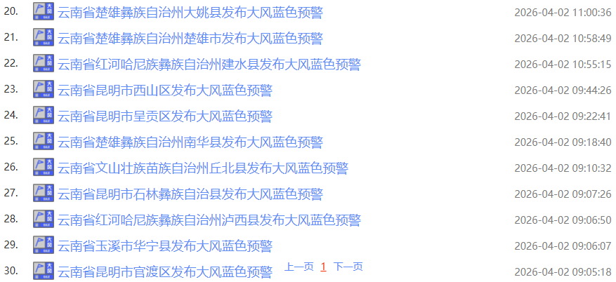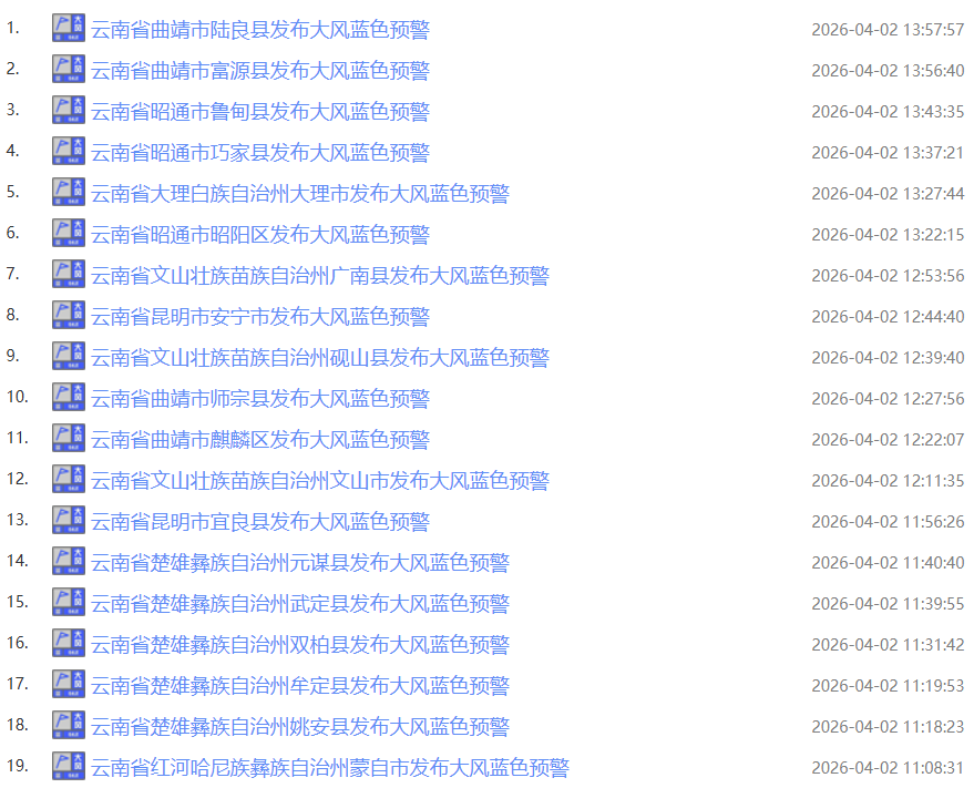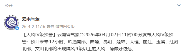 4月2日,云南省气象台发布大风Ⅳ级预警:预计未来12小时,昭通南部、曲靖、昆明、楚雄、大理、丽江、玉溪、红河北部、文山北部将出现阵风9级以上的大风,请做好防范。