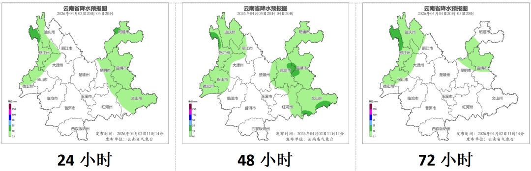 4月2日20时到4月3日20时:迪庆州西部、怒江州、丽江市西部、大理州西部、保山市北部、德宏州北部、昭通市、曲靖市、昆明市东部、文山州、红河州北部多云间阴有阵雨局部中雨,其他地区晴间多云。