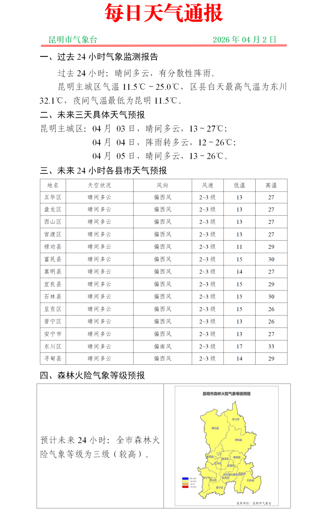 昆明城区天气预报