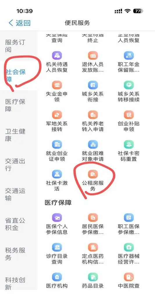 3.点击屏幕左方“社会保障”,然后点击“公租房服务”。