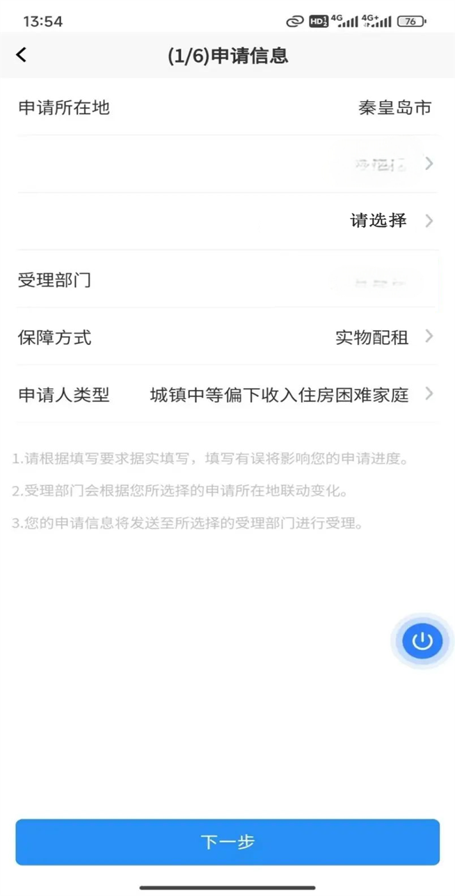 7.填写申请信息选择海港区,然后点击“下一步”。