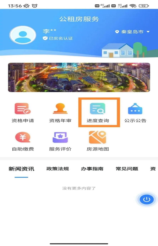 10.公租房服务首页点击“进度查询”,可以查看办理进度和提交申请信息的详情。