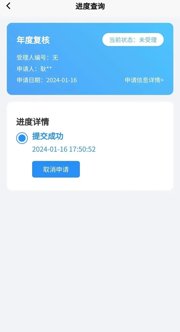5. 提交完成后,可在进度查询中查看进度详情,如显示提交成功,请耐心等待年审结果即可。
