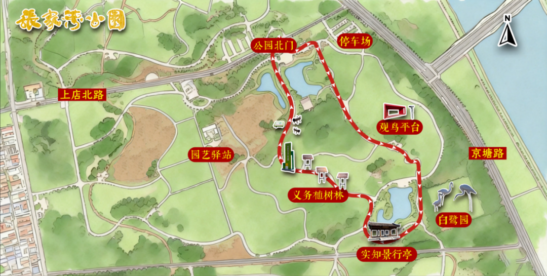 此次推出的观鸟路线从公园北门出发,串联起林间步道、观鸟高台、栖鹭湖、实知景行亭等多个特色点位,兼顾游玩舒适度与观鸟体验感,全程免费开放,无需预约。