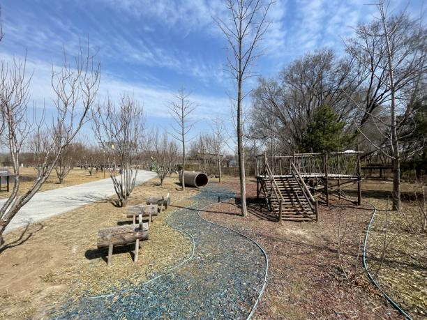 继续沿主路向北前行,即可返回张家湾公园北门。经途道路两侧设有亲子休闲设施,可供儿童游玩休憩。