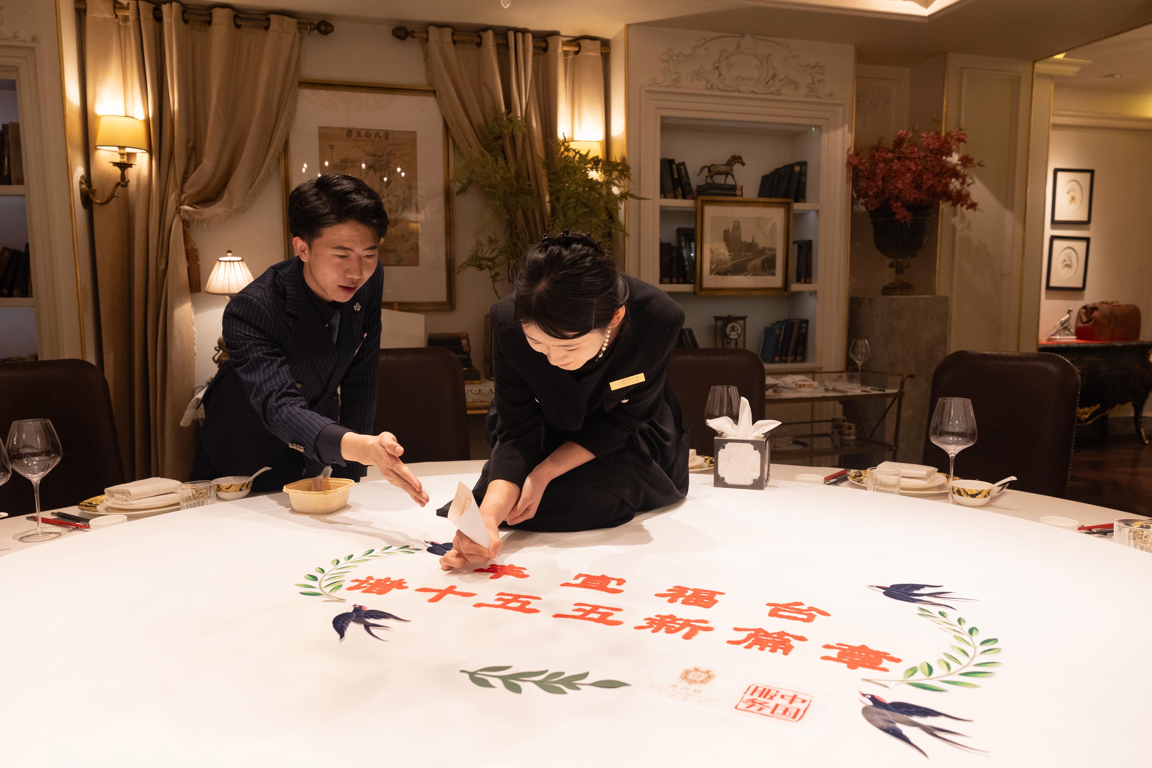 今年春招中招聘的首批35名宴会定制服务师已完成岗前培训,正以专业姿态走上岗位。从孩子的出生宴到老夫妻的钻石婚,宴会定制服务师将人生36个重要时刻化为36种主题宴会,通过与客户反复沟通方案、敲定细节,从场景布置、调试设备的全流程跟进,到宴会期间的全程值守、贴心服务,这场私人定制,把普通一餐变为充满仪式感的情感表达。