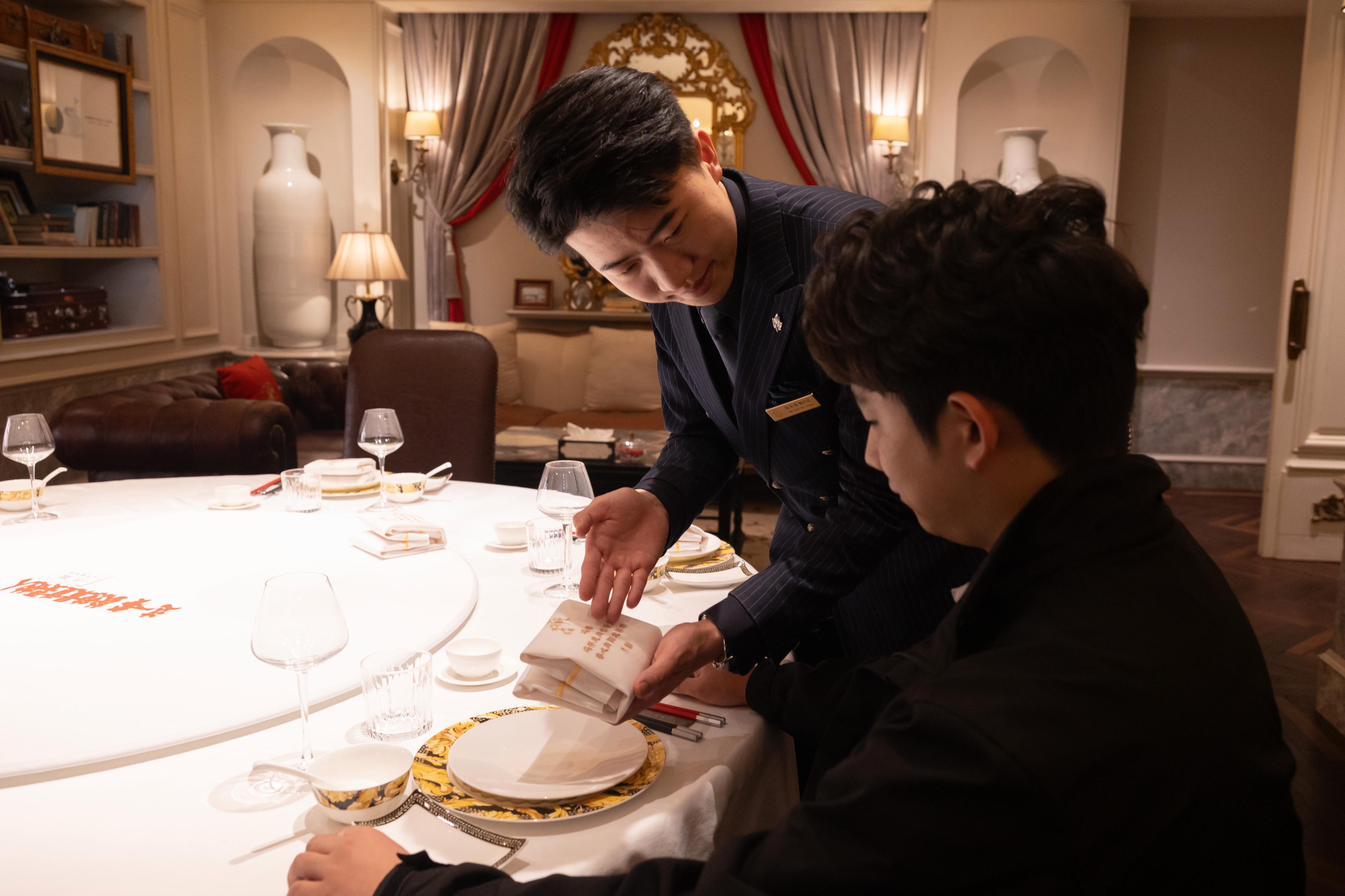 “我觉得这份工作创新性、可持续发展性都非常好。”今年春招,魏世堃入职北京宴总店,成为一名宴会定制服务师。谈起这个新职业、新岗位,他言语间透着喜悦,平时他根据宴会的主题对沙盘、口布等进行定制,安排个性化服务场景。让他印象最深的是第一次把客人的名字融入藏头诗,呈现在专属口布上时,“对方的称赞,让我至今难忘。那种在别处难以获得的仪式感与归属感,正是我们最想传递的温度。客人的笑容与感动,是对我最大的认可,也让我真切体会到自我价值的实现。”