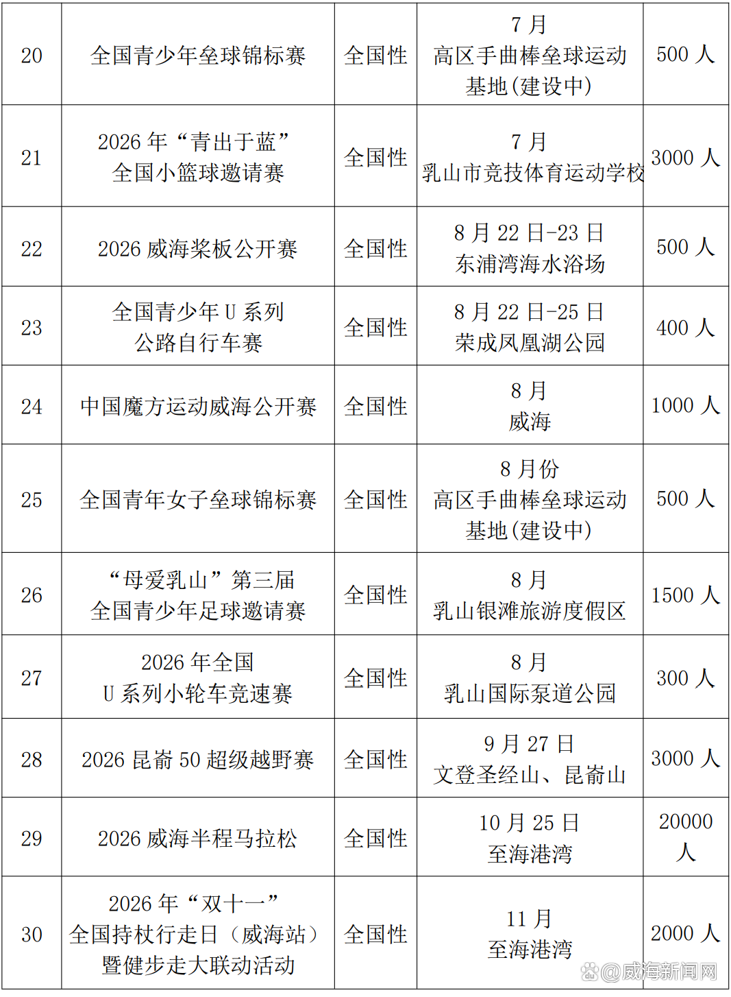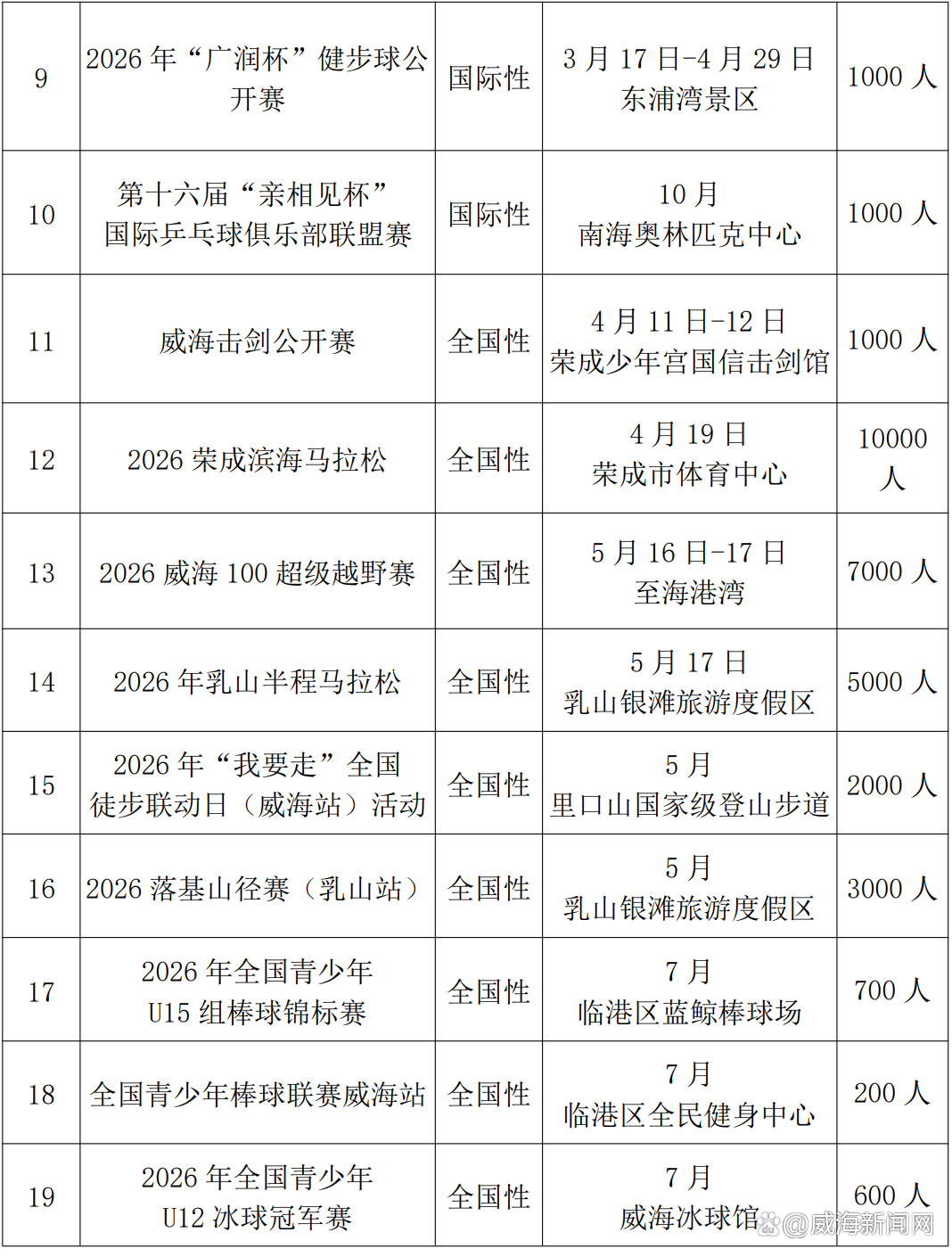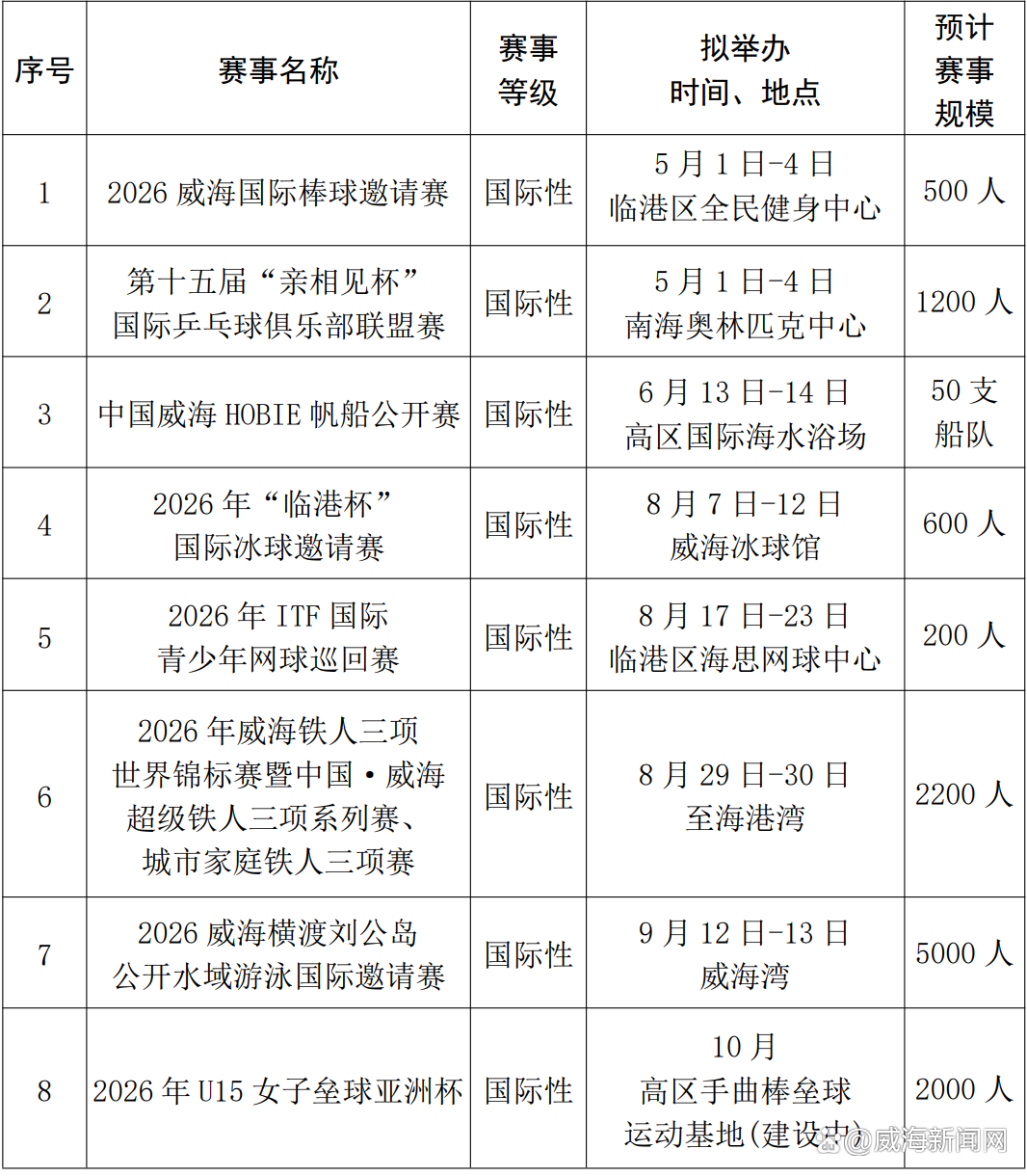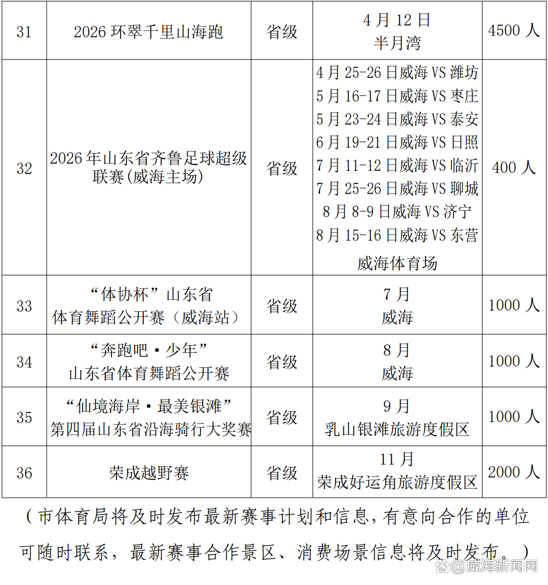 为发展赛事经济、促进体育消费,2026年威海市计划举办200余项大型体育赛事活动,其中,威海铁人三项赛、威海100超级越野、威海半程马拉松、横渡刘公岛公开水域游泳等赛事突显赛事规模大、市外参赛人员占比高、赛事消费力显著等特点。为给广大商家和消费者搭建共赢平台,市体育局、市商务局、市文化和旅游局联合推出2026年度“跟着体育赛事去旅行”活动,共征集了73个合作景区、商家、消费场景,可向赛会人员提供消费优惠。现公告如下。