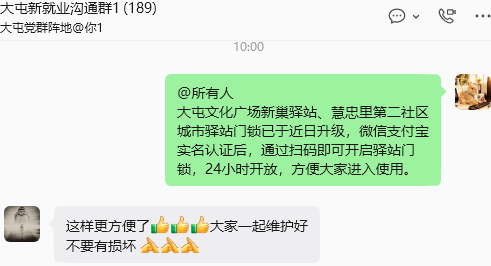 智能门禁系统标志着驿站服务迈向数字化、智能化,更是街道关心关爱新就业群体的又一暖心举措。后续,大屯街道将聚焦新就业群体实际需求,持续深化友好场景建设,让新巢驿站真正成为他们融入城市、安心奋斗的坚实后盾,为打造“时时有网、处处有家、人人有爱”治理共同体贡献大屯力量。