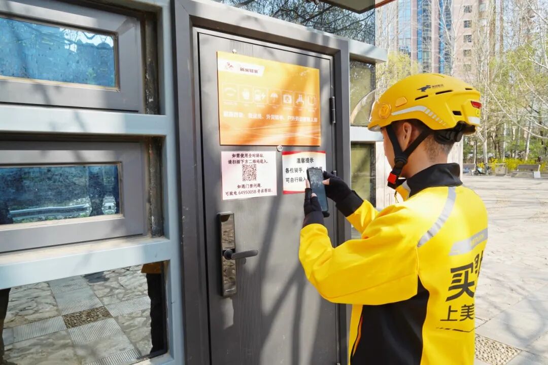 在新巢驿站,骑手扫码验证后门锁自动开启,整个过程方便快捷。智能门禁系统有效突破时间壁垒,延伸服务触角,让骑手可以随时进入驿站享受休憩、饮水、手机充电等多样化便捷服务。