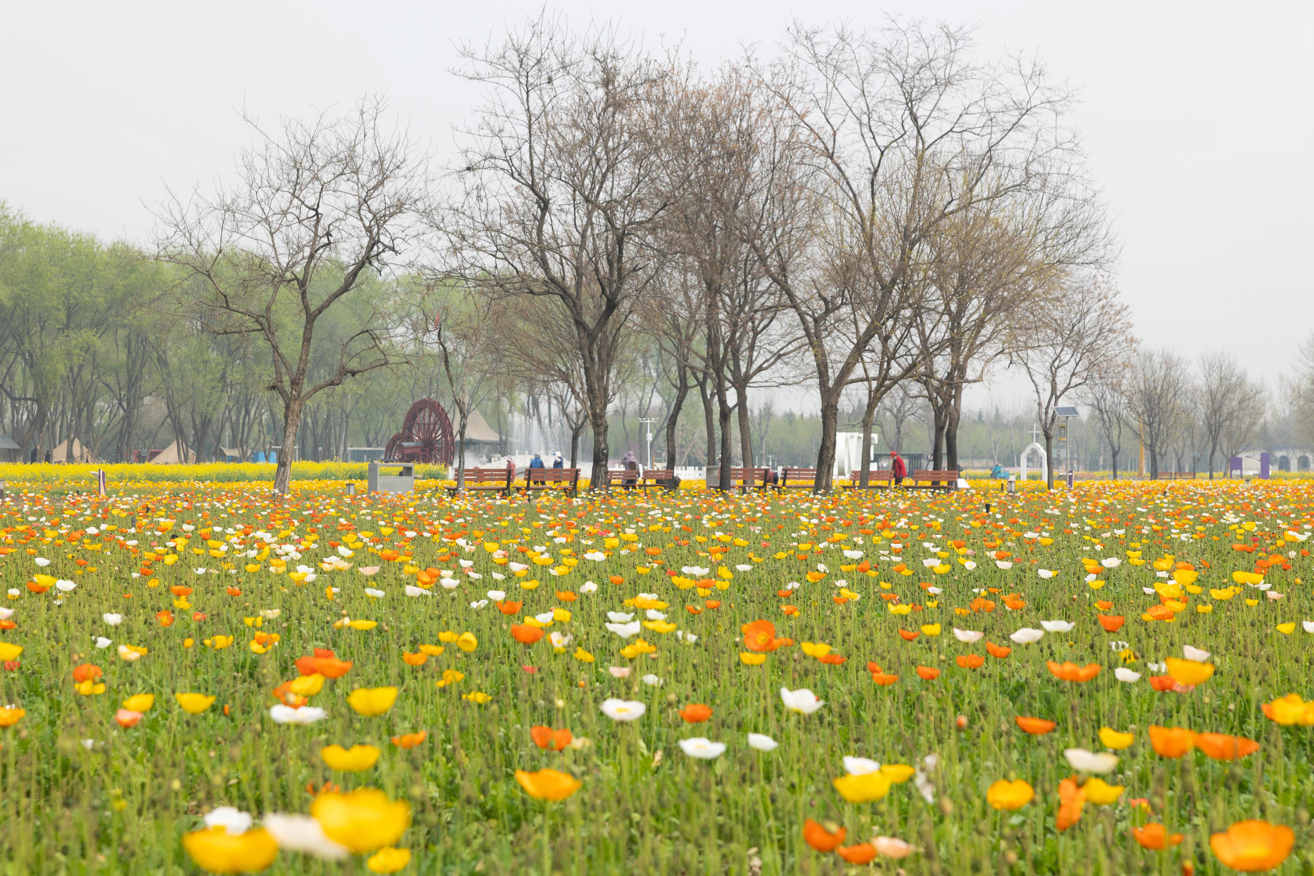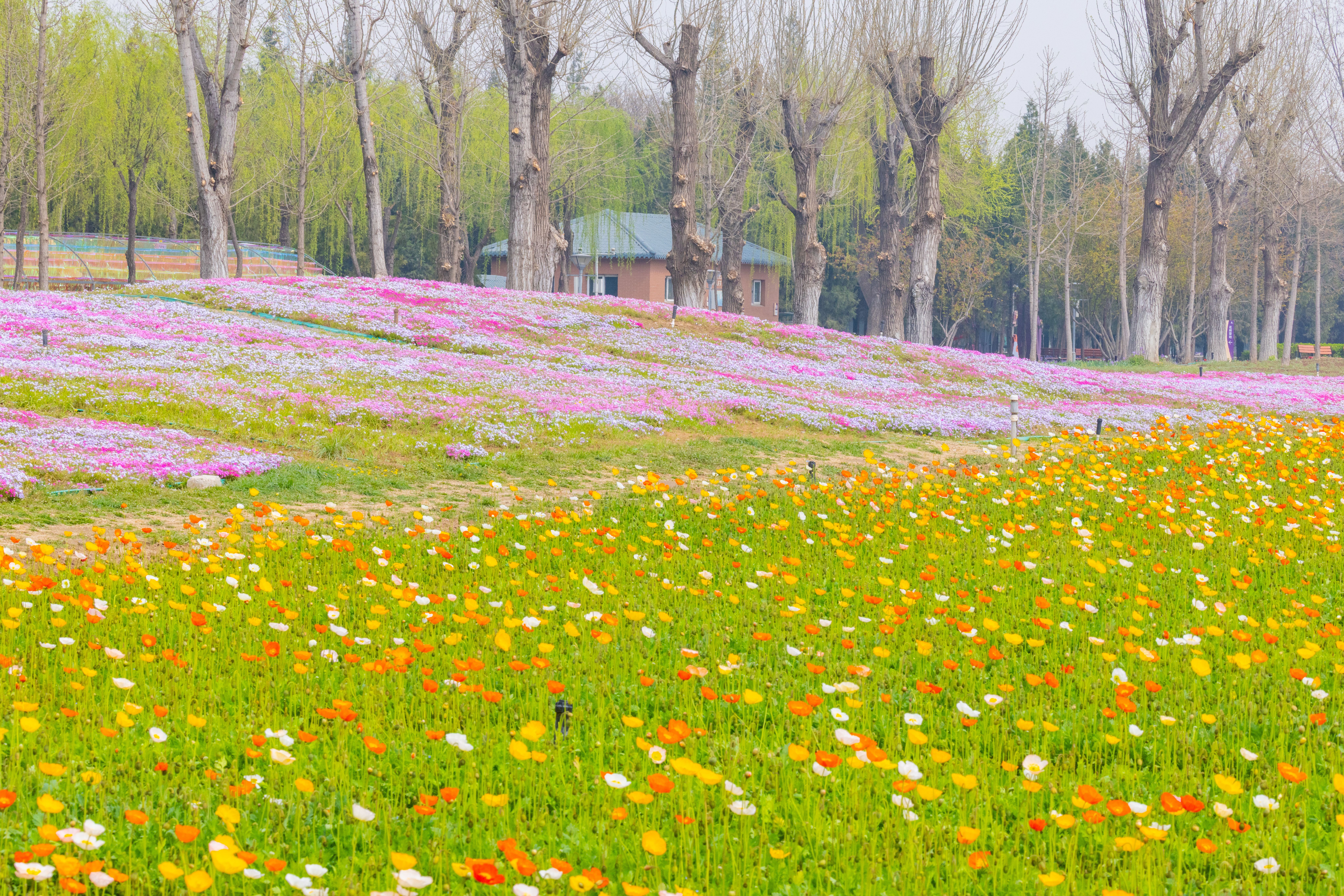 走进紫谷伊甸园,阳光透过树林,将成片的二月兰照得如梦似幻。观赏花卉区达500亩,其中冰岛虞美人花海逐步进入盛花期,橙、白、粉、黄色的花瓣在风中热情碰撞,纤细的花茎在微风中轻轻摇曳,仿佛打翻了大自然的调色盘。木质小亭子、白色三角钢琴、粉色风车错落点缀在花海之中,成为游客拍照打卡的绝佳点位。山坡上,芝樱紧贴地面盛放,像一张粉紫色的地毯。一旁的油菜花正值最佳观赏期,一望无际,金黄灿烂。