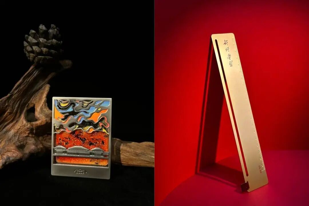 ▲图为香山革命纪念馆文创产品流沙冰箱贴和好好学习黄铜尺。