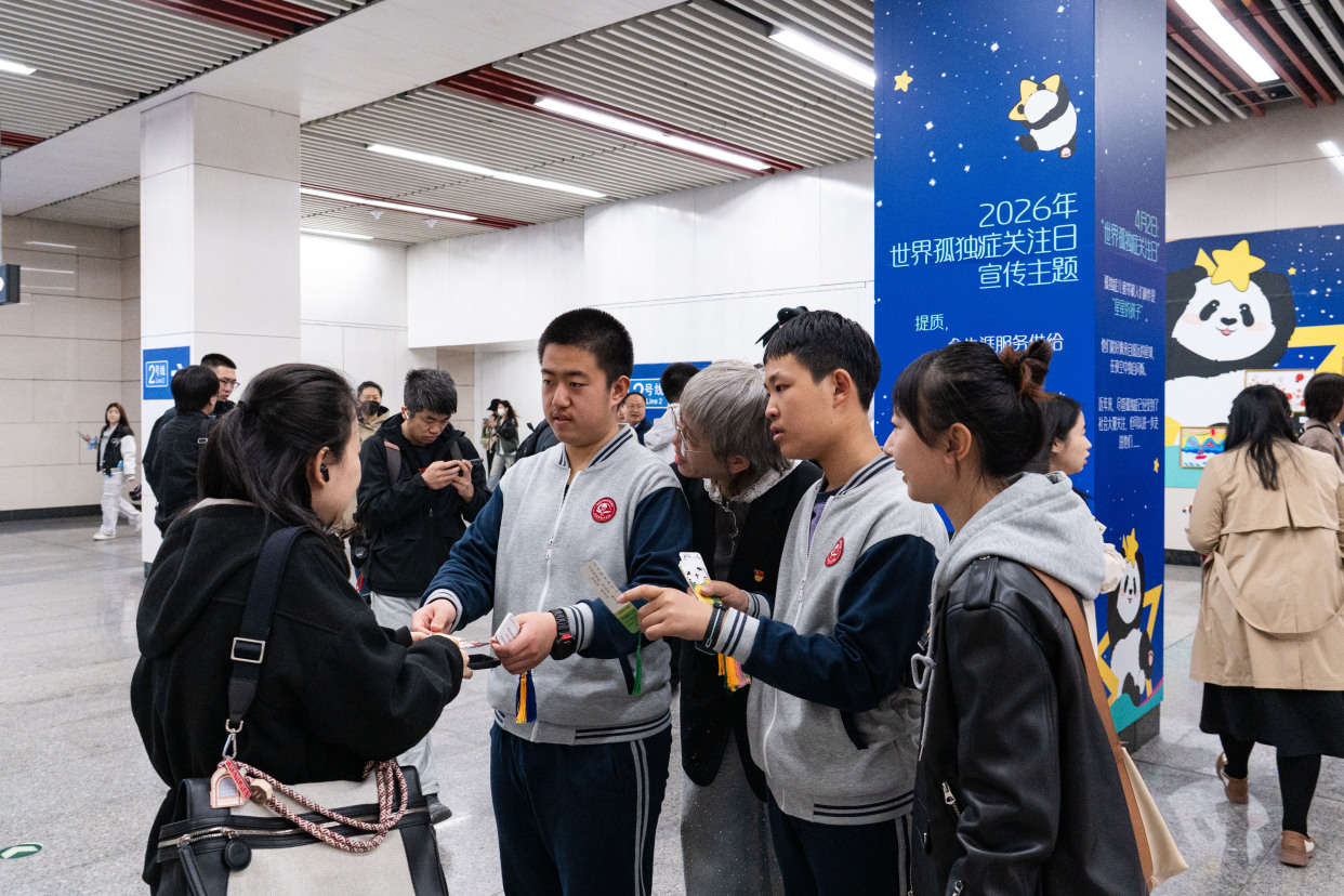 当天上午,“星星的画语,职场的潜能——让艺术成为沟通的桥梁”公益倡导活动在北京地铁6号线朝阳门站举行。现场展出了24幅孤独症学生画作,作者来自北京市盲人学校(星启学校)、石景山区培智中心学校、延庆区特殊教育中心、房山区特殊教育学校、怀柔区特殊教育学校等5所学校。星启学校的孤独症学生在老师的陪伴下,现场参与了以“春日绽放”为主题的手绘书签活动,表达自己丰富的内心世界。