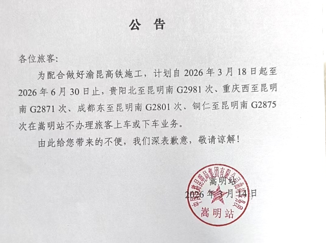 2026年3月18日至6月30日期间,这四趟列车嵩明站将暂停上下客: