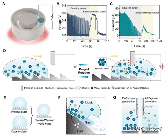 这项工作的关键,在于对传统莱顿弗罗斯特现象所带来的界面阻碍进行了重新利用与调控。研究团队通过界面工程方法,构建了动态稳定的“固-液-气”三相接触状态,将动态非对称双电层发电与水系原电池反应耦合起来,使微小液滴在运动过程中持续产生电信号。实验结果表明,仅需30微升液滴,即可连续产生超过100个脉冲直流信号,展现出良好的界面能量转换潜力。在此基础上,团队进一步设计了仿生集雾装置,并与自推进发电系统集成,构建出“水蒸气收集—液滴发电—循环利用”的闭环路径。该研究不仅为分布式热能回收提供了新的技术方案,也展示了多种微尺度能量转换机制协同工作的可能性,为相关器件的小型化、集成化设计提供了重要支撑。
