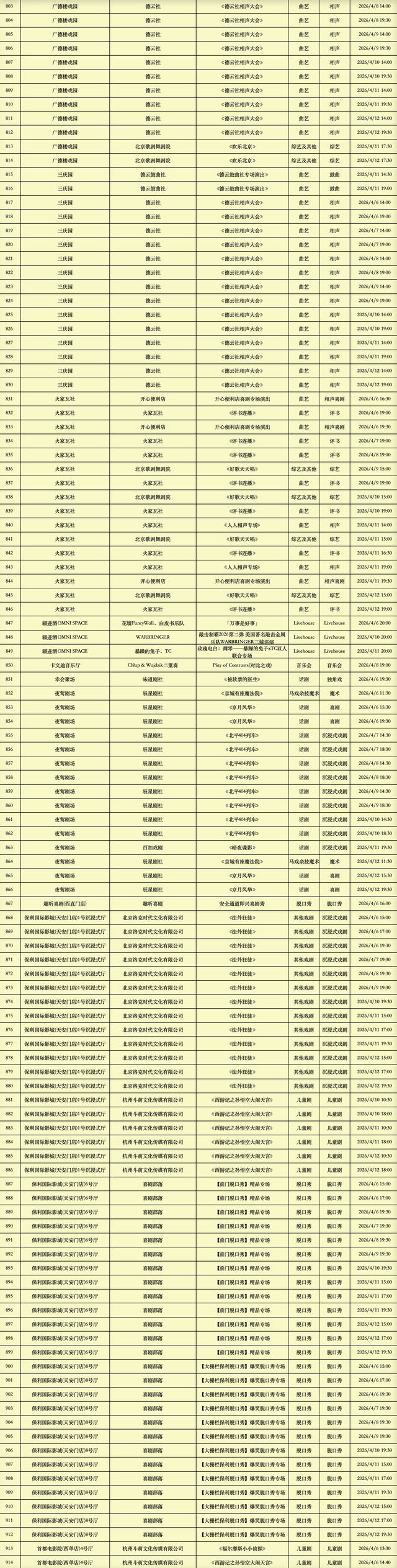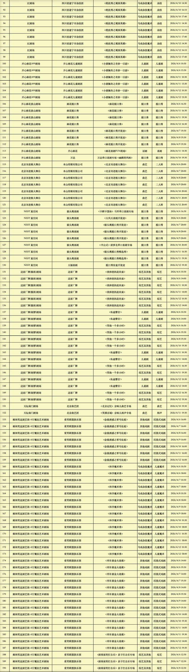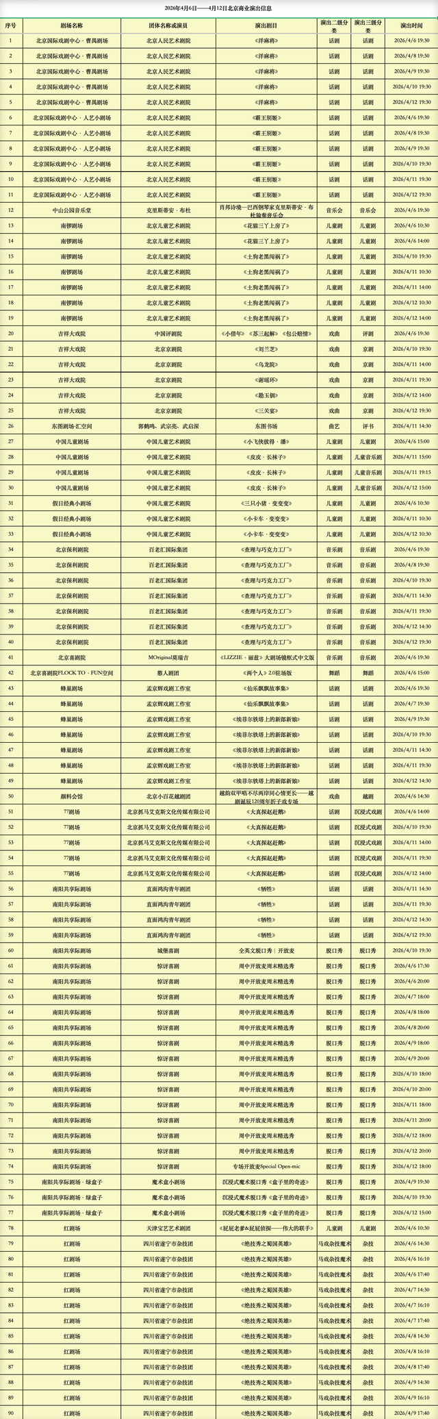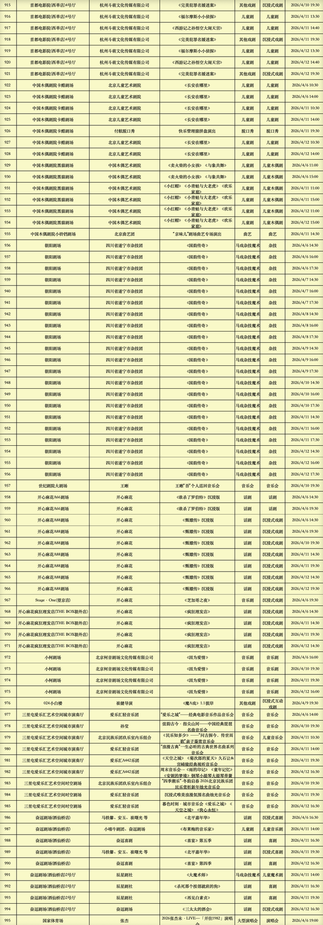 2026年4月6日-2026年4月12日北京商业演出信息新鲜“出炉”!话剧、喜剧、京剧、昆曲、北京曲剧、音乐剧、儿童舞台剧、儿童亲子剧、儿童木偶剧、儿童音乐剧、儿童剧、儿童魔术剧、儿童杂技、沉浸式戏剧、沉浸式喜剧、音乐会、演唱会、Livehouse、芭蕾舞剧、相声、评书、鼓曲、曲艺、二人转、脱口秀、综艺、杂技等一大波精彩演出来了,你想看的全都有,安排起来!(演出信息可能发生变化,以实际演出情况为准)