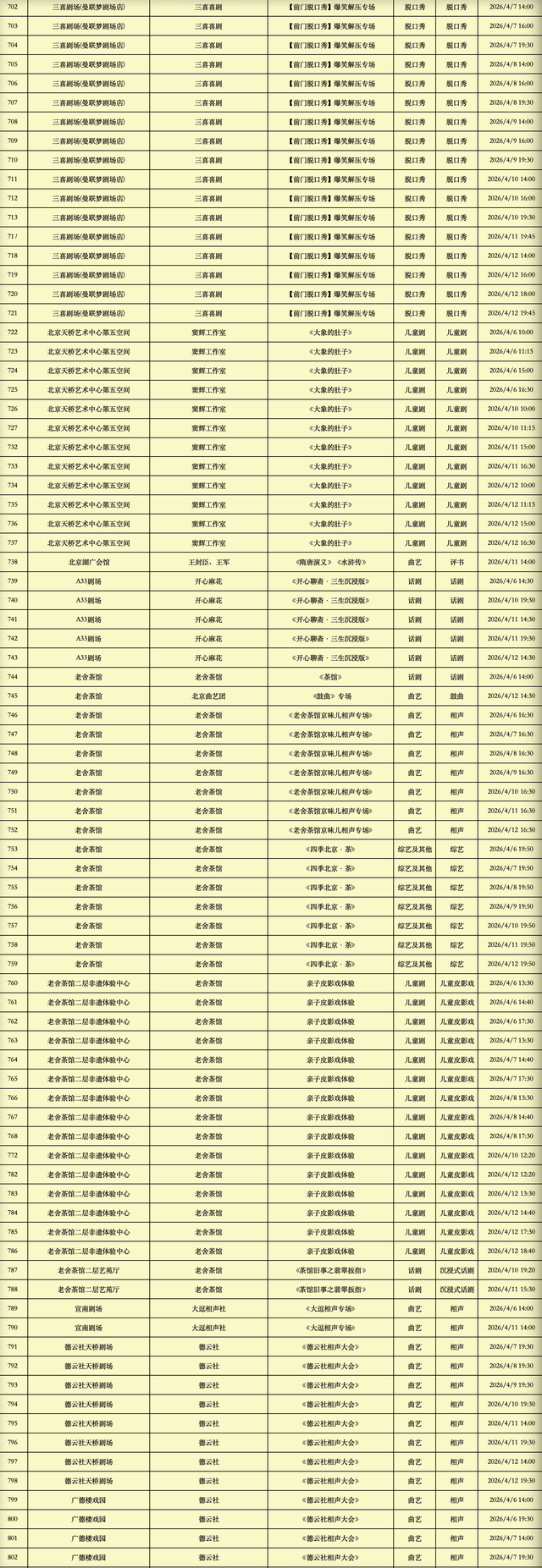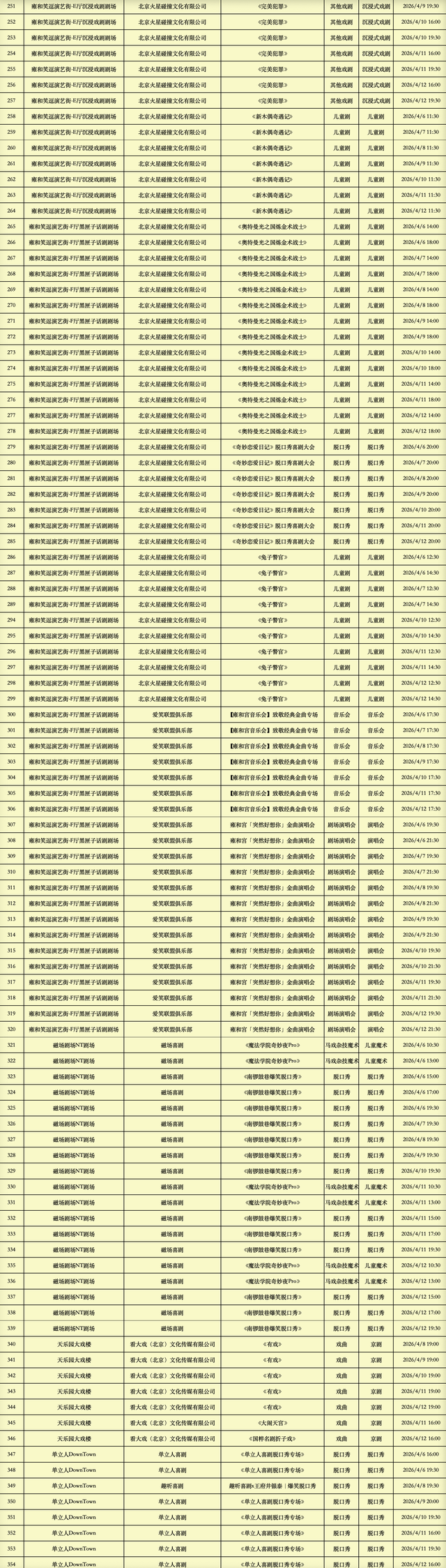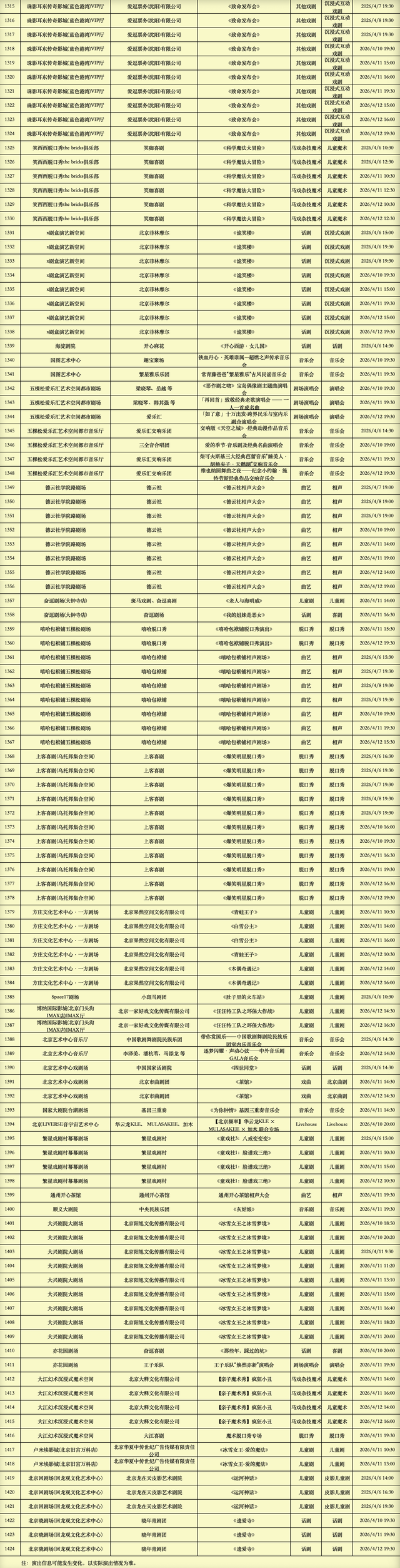 2026年4月6日-2026年4月12日北京商业演出信息新鲜“出炉”!话剧、喜剧、京剧、昆曲、北京曲剧、音乐剧、儿童舞台剧、儿童亲子剧、儿童木偶剧、儿童音乐剧、儿童剧、儿童魔术剧、儿童杂技、沉浸式戏剧、沉浸式喜剧、音乐会、演唱会、Livehouse、芭蕾舞剧、相声、评书、鼓曲、曲艺、二人转、脱口秀、综艺、杂技等一大波精彩演出来了,你想看的全都有,安排起来!(演出信息可能发生变化,以实际演出情况为准)