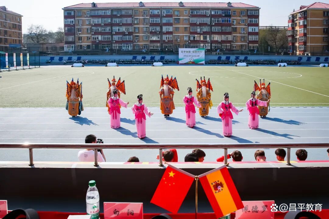 绿茵场不仅是竞技的舞台,更是文化交融的窗口。昌平一中学生以一支活力四射的啦啦操点燃全场,青春的热情感染了每一位来宾。紧接着,京剧表演惊艳登场——唱念做打间,国粹的韵味与底蕴赢得西班牙小球员们的阵阵掌声。中场休息时,民族舞蹈《舞韵中华》再次将中华文化的悠远与多彩展现在绿茵场上。
