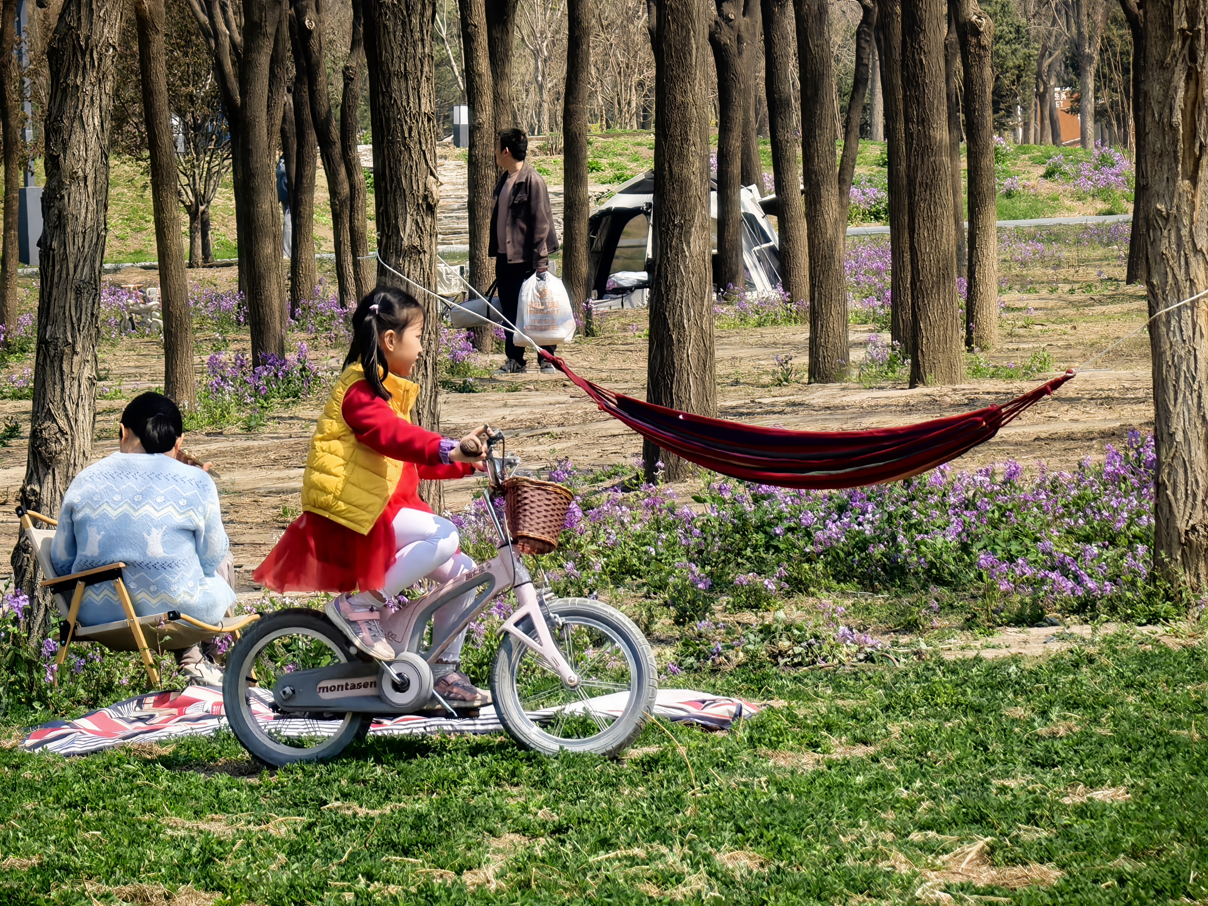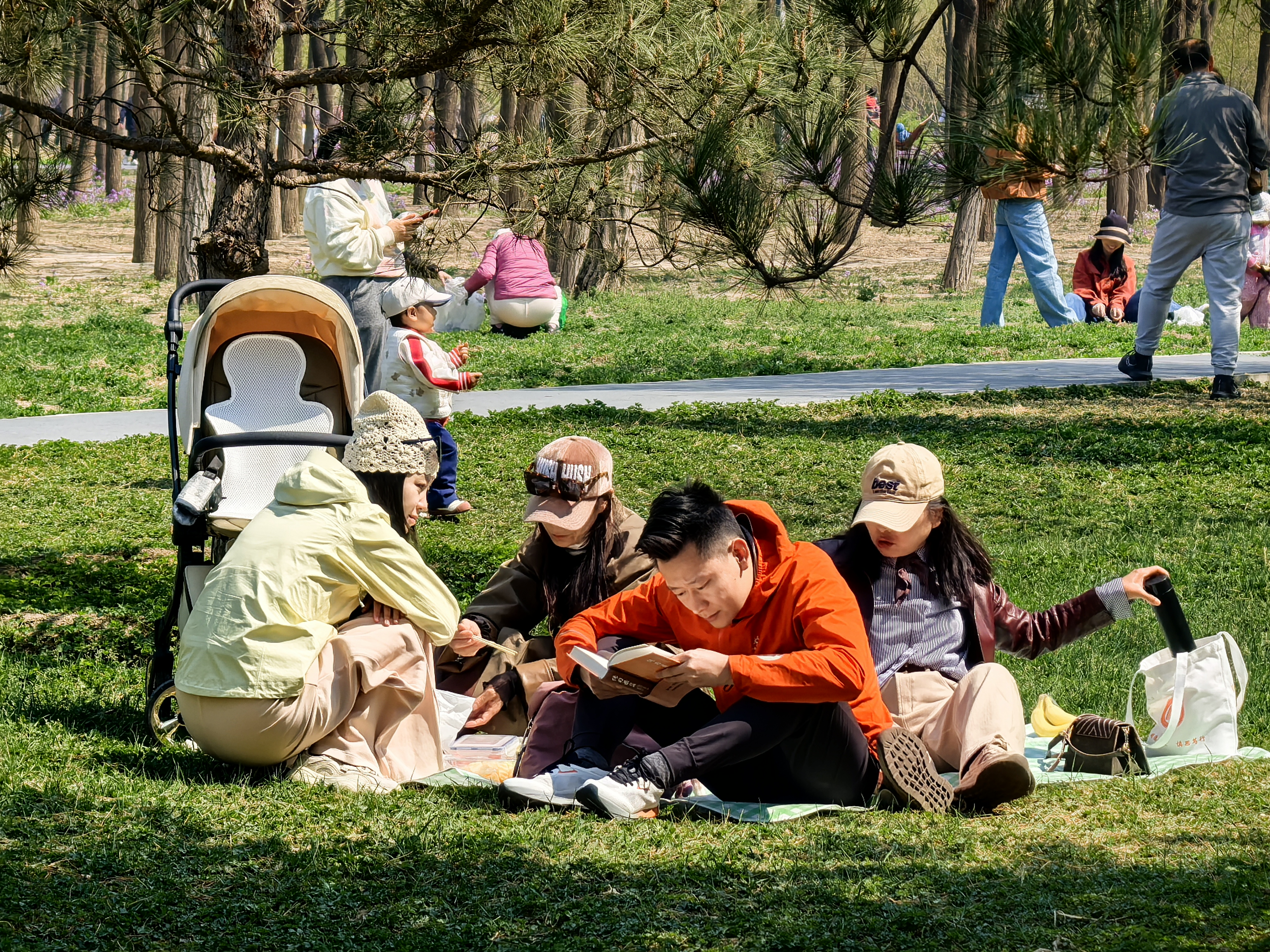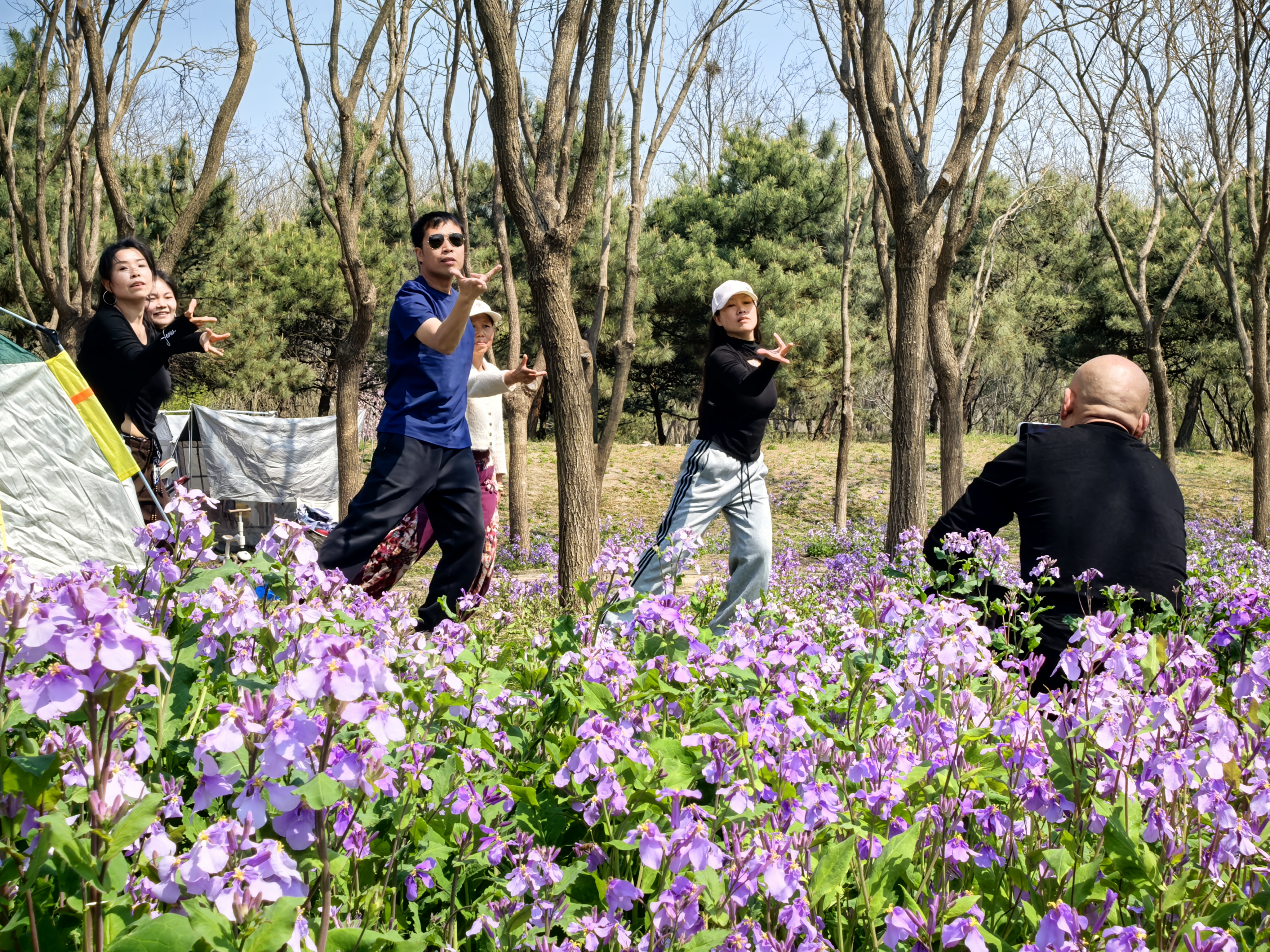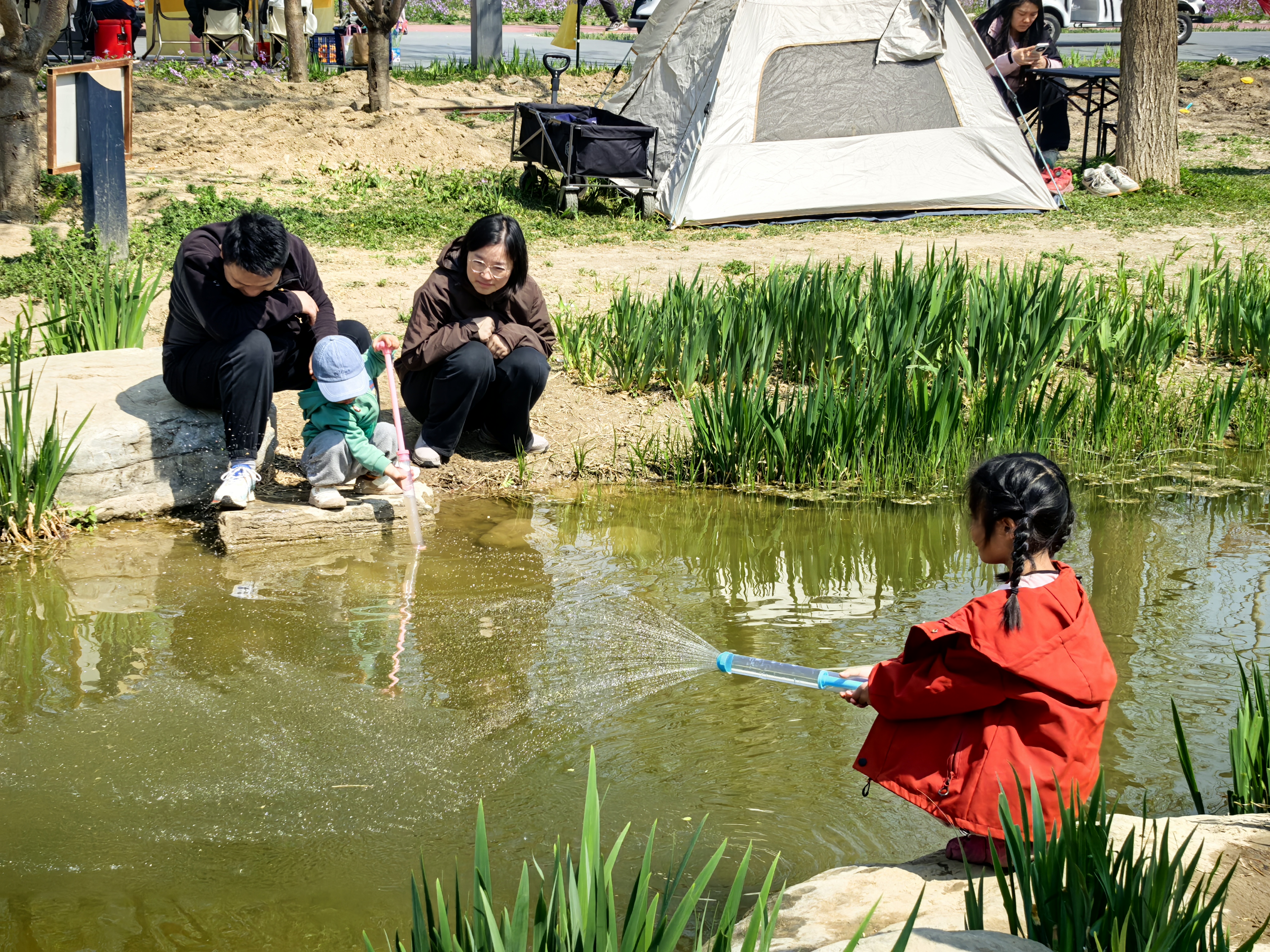 春日还是露营的最佳时刻。南森露营区依旧免费面向市民开放。从北1门进入,沿途乔木林立,溪流潺潺,春花树下、花草地间,市民游客们搭建的帐篷鳞次栉比,不少家长带着孩子嬉水打闹,也有三两好友相约野餐放松一下,与自然零距离,在园中“森”呼吸。“脚下是泥土,头顶是天空,这种回归自然的律动感是练功房给不了的,在这里跳舞身体的能量都释放出来了。”大学生吴雪与街舞社团成员在露营时尽展舞姿,把大自然当成舞台。