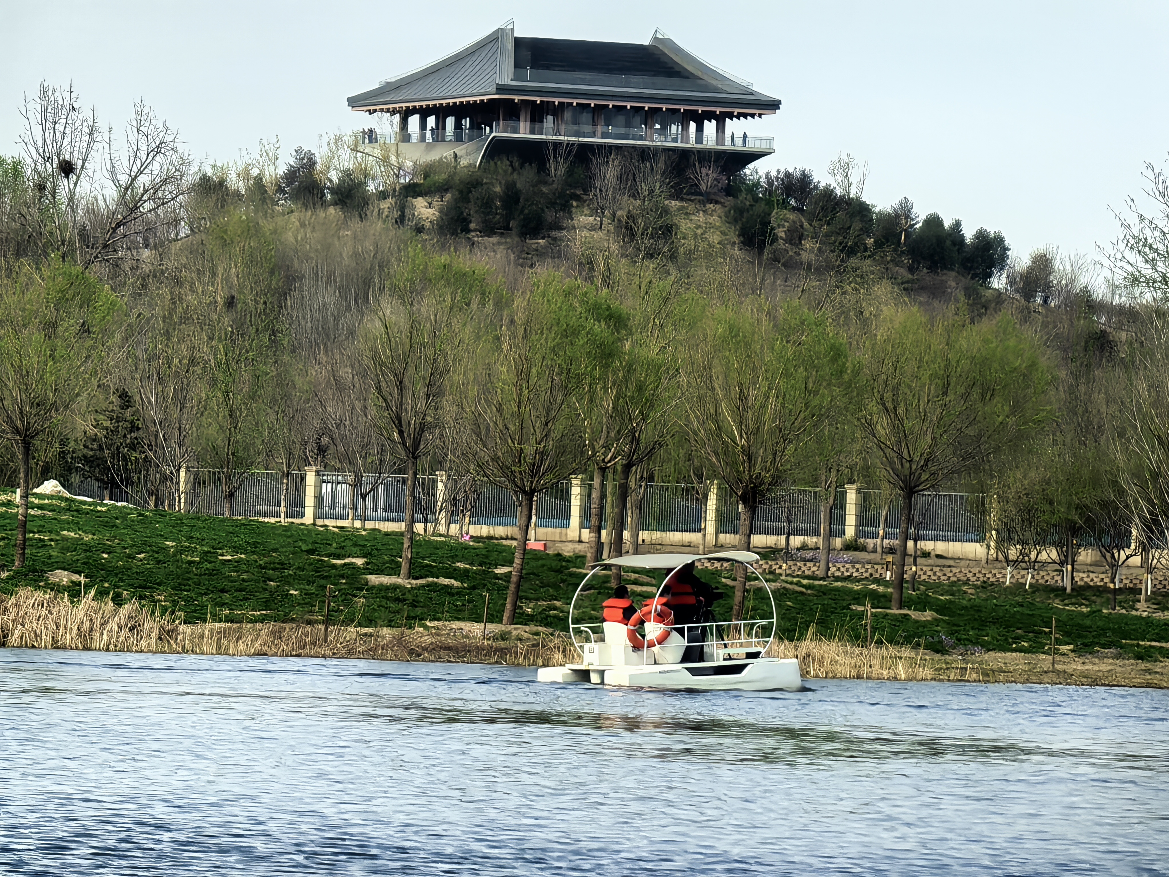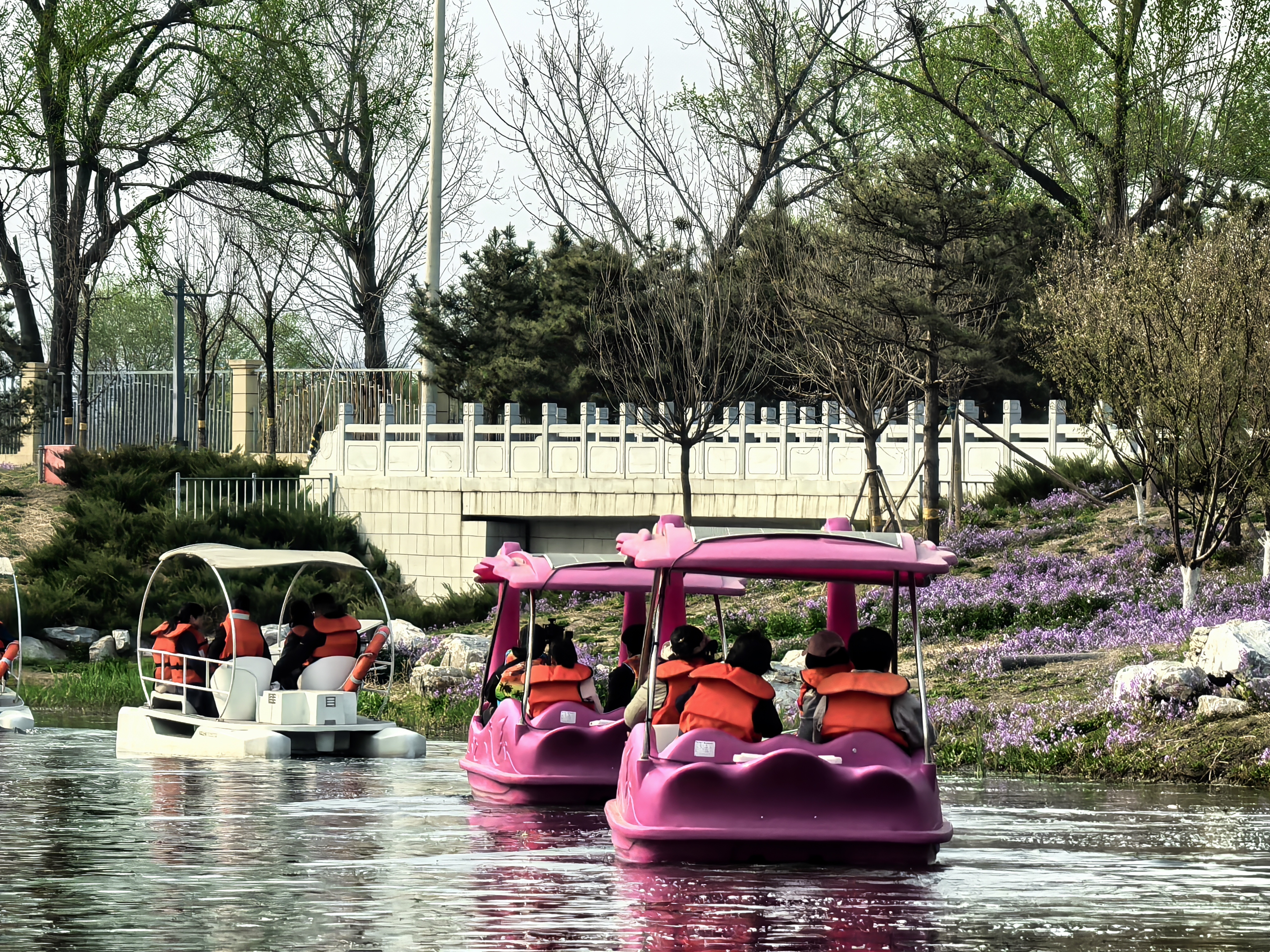 在森林的另一边,泛舟上林湖成了不少游客的游园选择。“一登上粉红色的火烈鸟游船,孩子就兴奋得不行。湖面很安静,两岸春花一片一片的,真是船在画中游。”带着全家来游玩的市民张女士感慨道。据悉,上林湖游船共投放30艘粉红色的火烈鸟和珍珠白的小游艇款式的六人座游船,运营时间为每天9点至19点(如遇大风天气将停止营业)。泛舟上林湖,最动人的莫过于移步换景的生态画卷。这里不仅是泛舟胜地,更是生物多样性的宝库——目前园区已记录野生鸟类174种、野生植物资源280种,成为北京城南的“天然生物基因库”。