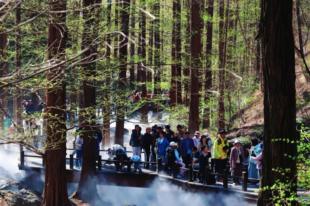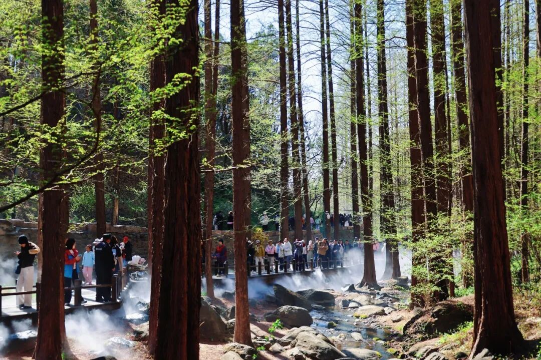 沿梅园木栈道缓步前行,另一番“梅”景在前方悄然铺展——栈道两侧的‘美人’梅正值花期,粉紫色的花瓣如云似霞,浓郁的色彩晕染春色。紧接着向前,还有樱桃沟喷雾仙气渺渺,搭配水杉新绿,引得游客们拍照留念纷纷定格这份春日美好。