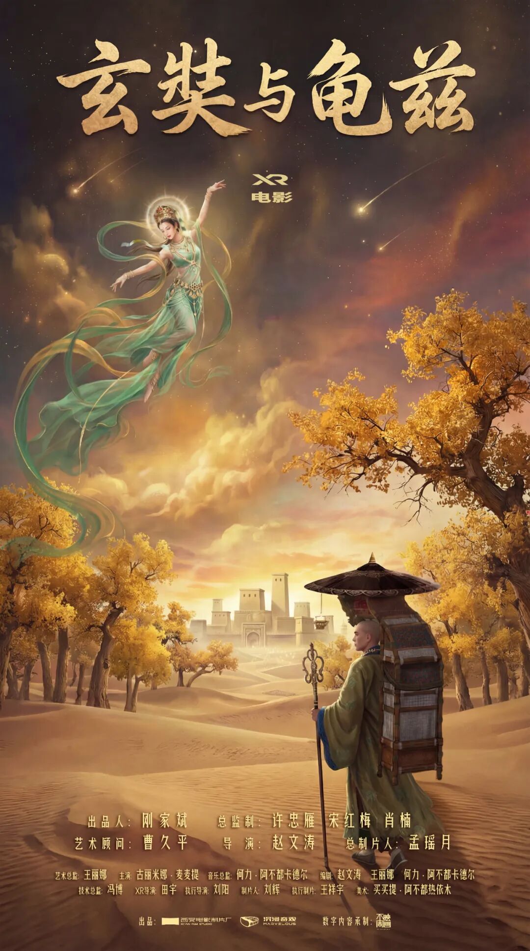 《玄奘与龟兹》海报一段跨越千年的心灵之旅,与唐玄奘一起探寻神秘的西域龟兹古国——在舞神阿布的引领下,亲临龟兹国克孜尔石窟、胡杨秘境、无遮大会与宫廷乐舞的盛景,感受古丝绸之路的瑰丽文明。面对真理的困惑,龟兹王的挽留,以及舞神的考验,玄奘会如何抉择……影片以玄奘西行的真实历史为叙事骨架,以 “知与行” 的哲学叩问为精神内核。观众不仅能沉浸式穿越回公元630年的龟兹古国,更能走入一场关于人生抉择的深度思辨之中。