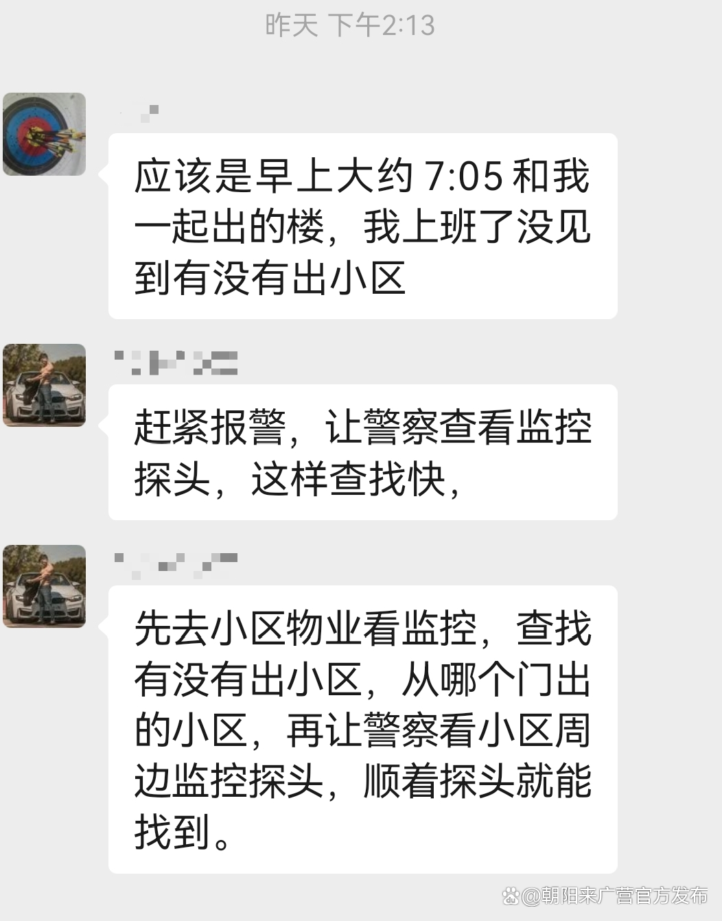 随后,社区工作人员联系物业,查看小区监控,确认老人已经离开小区范围。14时,社区报警并说明情况,希望警察尽快找到老人。