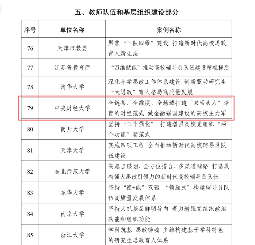 近日,教育部思想政治工作司公布首批100个新时代学校思想政治教育典型案例,我校选送的案例《全链条、全维度、全场域打造“双带头人”培育的财经范式 做金融强国建设的高校主力军》入选。