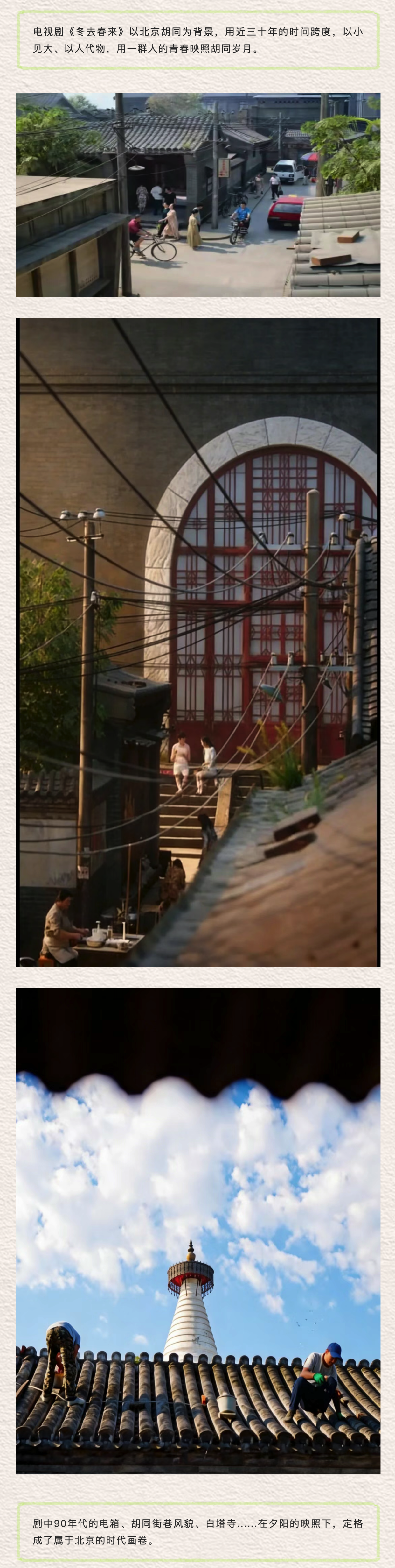 最近电视剧《冬去春来》正在央视热播,有人说它是一部年代剧,而小编觉得它更像一场胡同里的直播,没有滤镜,直接把大家带入胡同角色……北京的春天很短、很美但它每年都来。架空线入地,白塔寺犹在。时传祥的故事仍被传颂,旧日胡同传出了新的热闹……