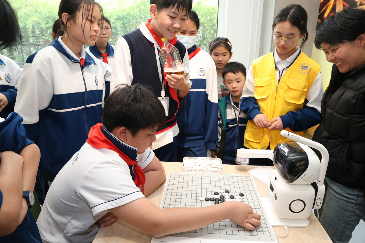 在展览的核心互动区,3台下棋机器人成为最吸引目光的焦点。这些机器人搭载先进的人工智能算法,具备高水平的对弈能力。低年级学生围坐在机器人旁尝试落子,机器人通过语音耐心讲解棋路;高年级学生则选择挑战模式,展开专业对决。一名正在与机器人对弈的学生说:“和机器人下棋太有趣了,它能提醒我哪里走得不对,还能告诉我更好的解法,比平时和同学下棋收获更多。”策展教师曲雯介绍,这一环节锻炼了孩子们的逻辑思维与专注力,更让他们直观理解了人工智能如何“思考”。