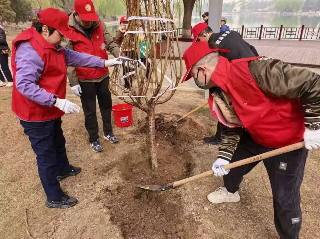 活动现场,工作人员详细讲解了植树技术要领。志愿者们分工协作,挥锹铲土、放苗扶正、培土浇水,精心栽种树苗,主动认养所栽树木,为首都添新绿。