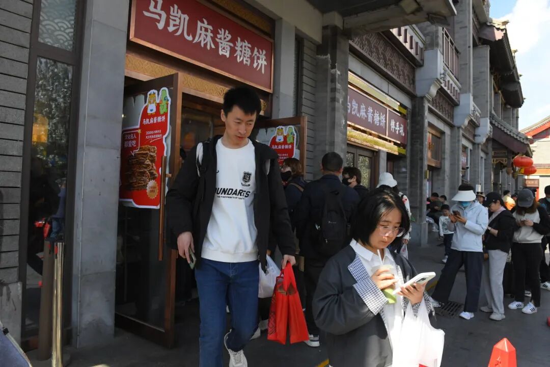 家庭聚餐、踏青游是清明小长假的关键词。在“京城文化名人会客厅”鼓楼马凯餐厅,堂食每天爆满,午餐、晚餐用餐高峰均需等位。其外卖窗口的麻酱糖饼平日里就是大排长龙的“网红单品”,小长假期间踏青游需求增加,麻酱糖饼窗口更是排出几十米长队,单窗口的每日销量就超过800张,窗口阿姨直呼:“烙不动了。”