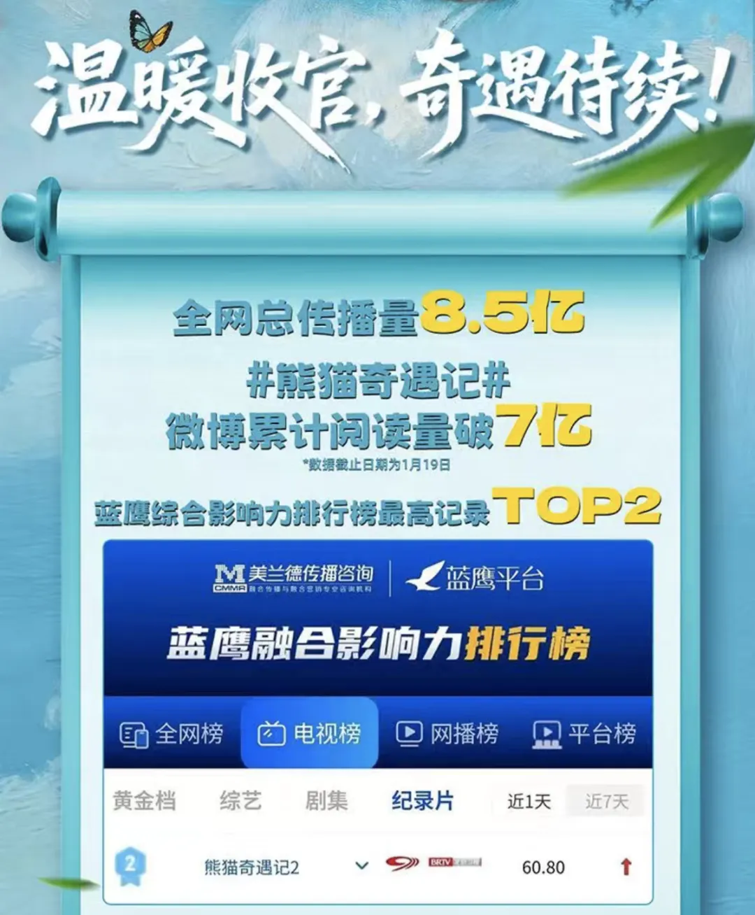 《熊猫奇遇记》第二季自开播以来,以全网总曝光量超8.5亿的亮眼成绩,实现了一场从荧屏到社交平台、从视觉到心灵的全方位“生态奇遇”。微博主话题#熊猫奇遇记 阅读量突破5.4亿,衍生话题累计超7亿;抖音、快手平台70余条精品短视频播放量超1.5亿次。电视端同样表现强劲,北京卫视CSM35城收视达1.284%,稳居周末黄金档前列。