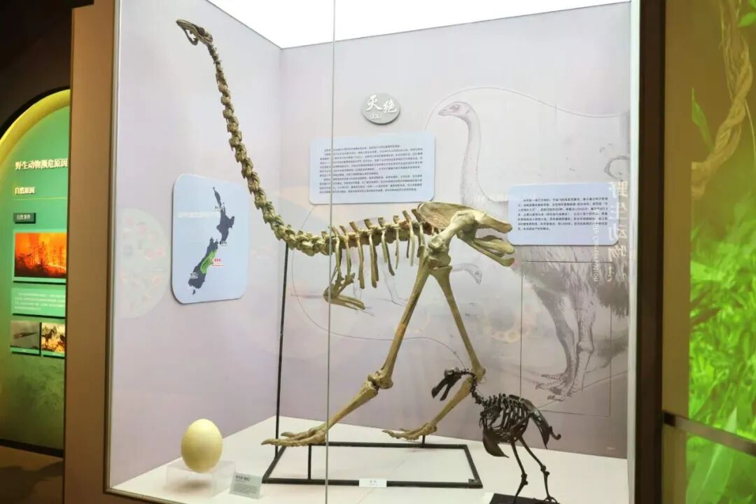 紧邻其旁的是一件极其珍贵的,也是保存在中国的唯一一件恐鸟骨骼化石,它是1956年新西兰文化代表团赠予中国人民的国礼。