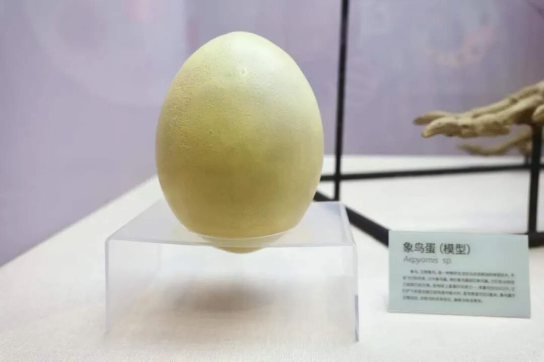 象鸟是一种曾栖息于马达加斯加的巨型鸟类。其身高可达三米以上,体重可达半吨;象鸟蛋大小是鸵鸟蛋的数倍。展厅中陈列的虽然是模型,但就是按照真实比例复原的。