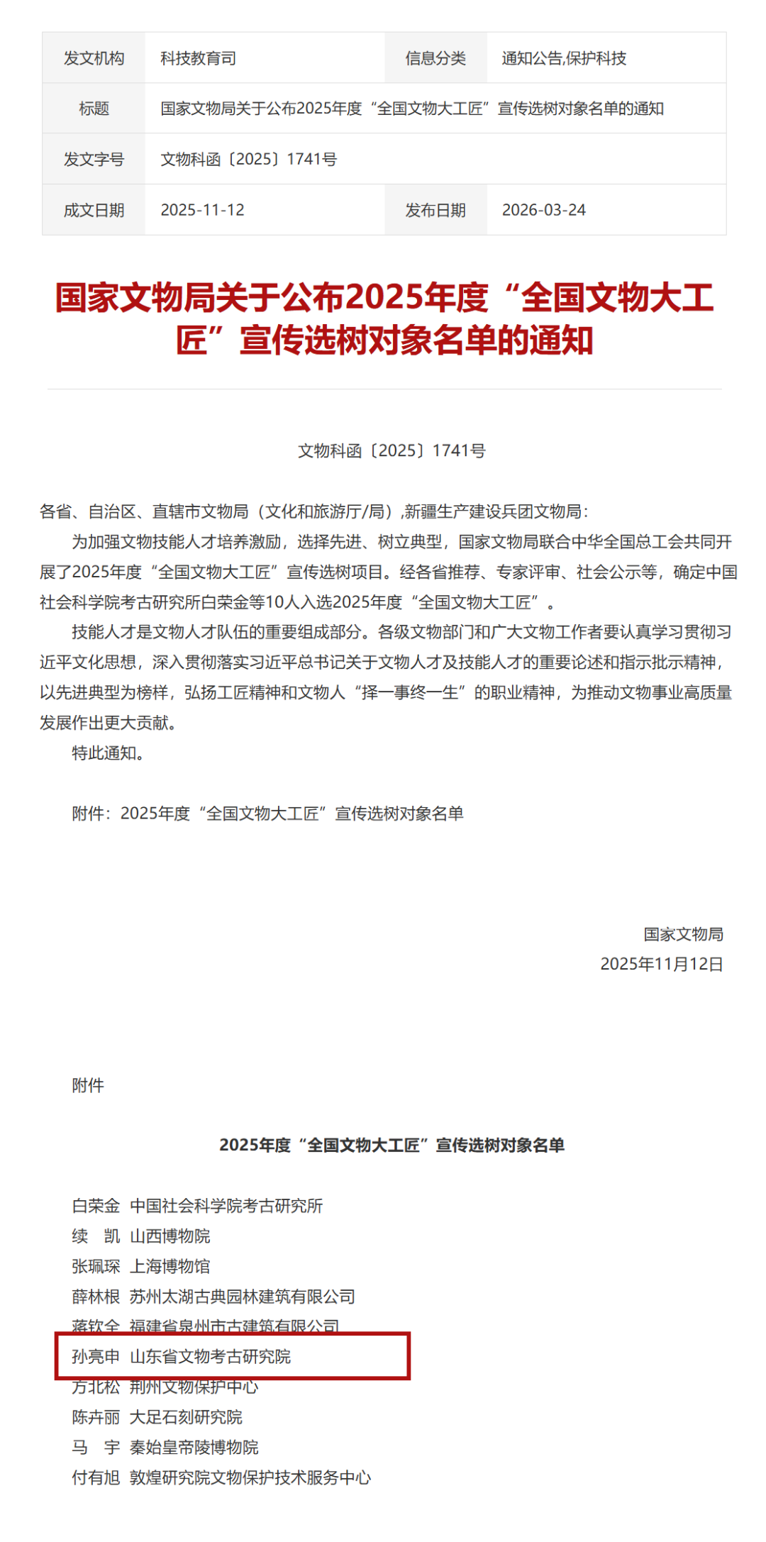 近日,国家文物局在京召开第一季度例行新闻发布会,发布首届“全国文物大工匠”宣传选树对象名单,山东省文物考古研究院孙亮申入选。