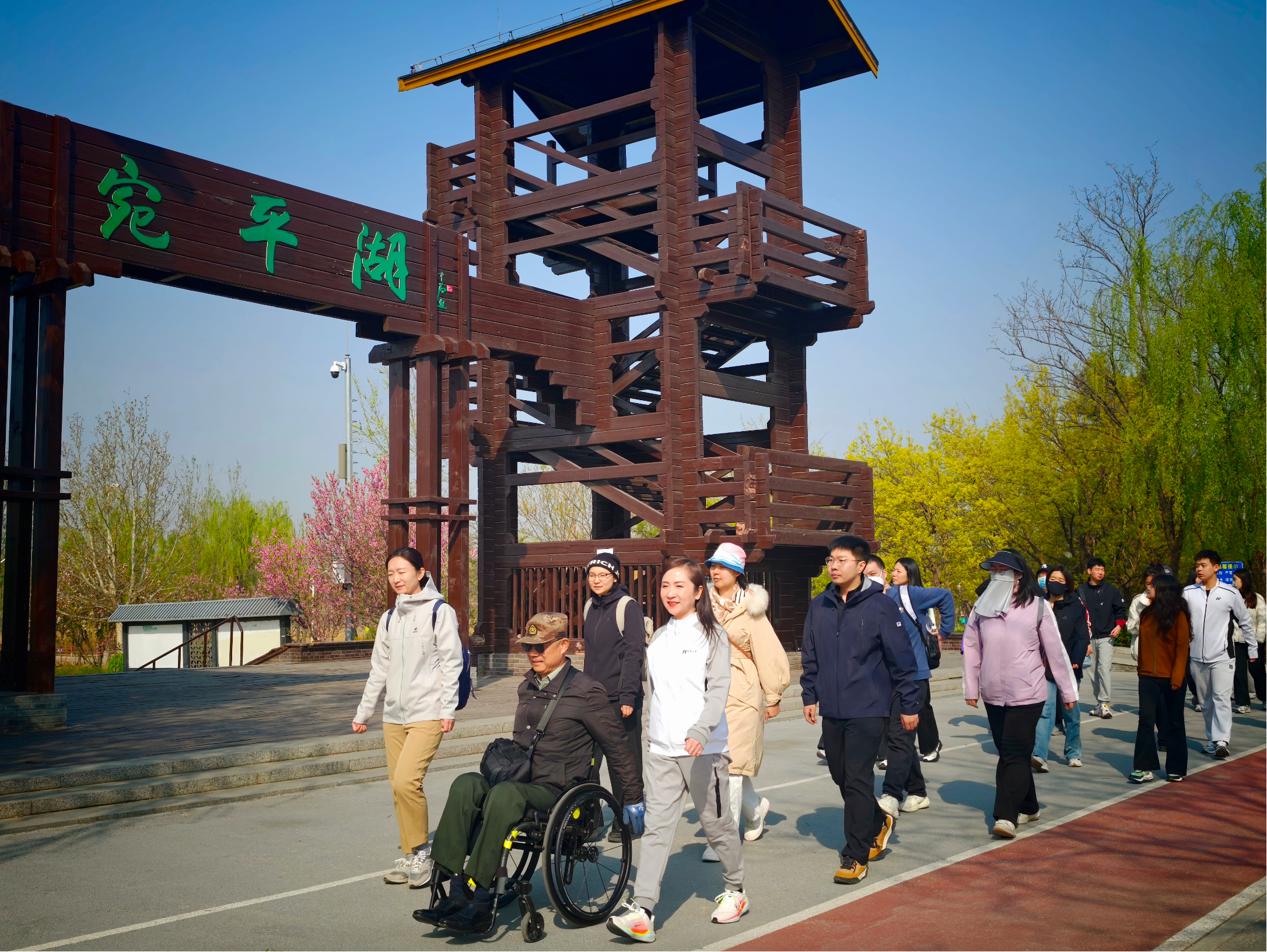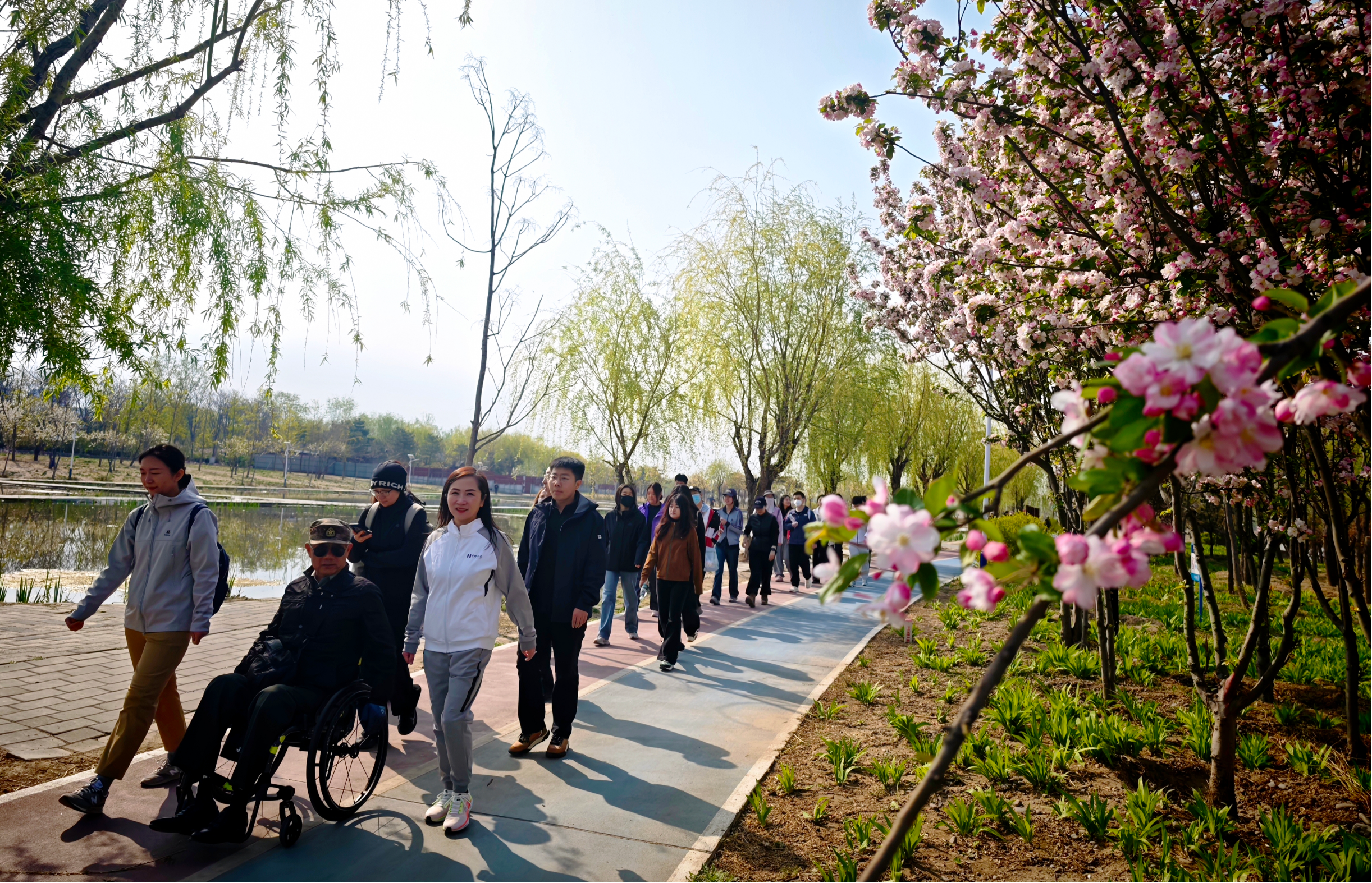 “永定河绿道丰台段,一河碧水,满路繁花。”坐在轮椅上的王曙光,望着眼前蜿蜒的彩色骑行道,忍不住感叹。4月8日,由丰台区委宣传部指导,区文化和旅游局、团区委联合主办的“绿道逐春·青春筑梦——永定河绿道体验暨文旅talk汇”活动在永定河绿道举行。来自区残联、区退役军人事务局、宛平街道等单位的团员青年代表,与战时一等功荣立者、2024年北京榜样王曙光,大红门社区卫生服务中心、2023年北京青年榜样邵丽颖,2022年北京青年榜样、首科大厦楼宇党委书记、总经理沈艳婷一同行走绿道、对话青春,以特殊方式迎接五四青年节。