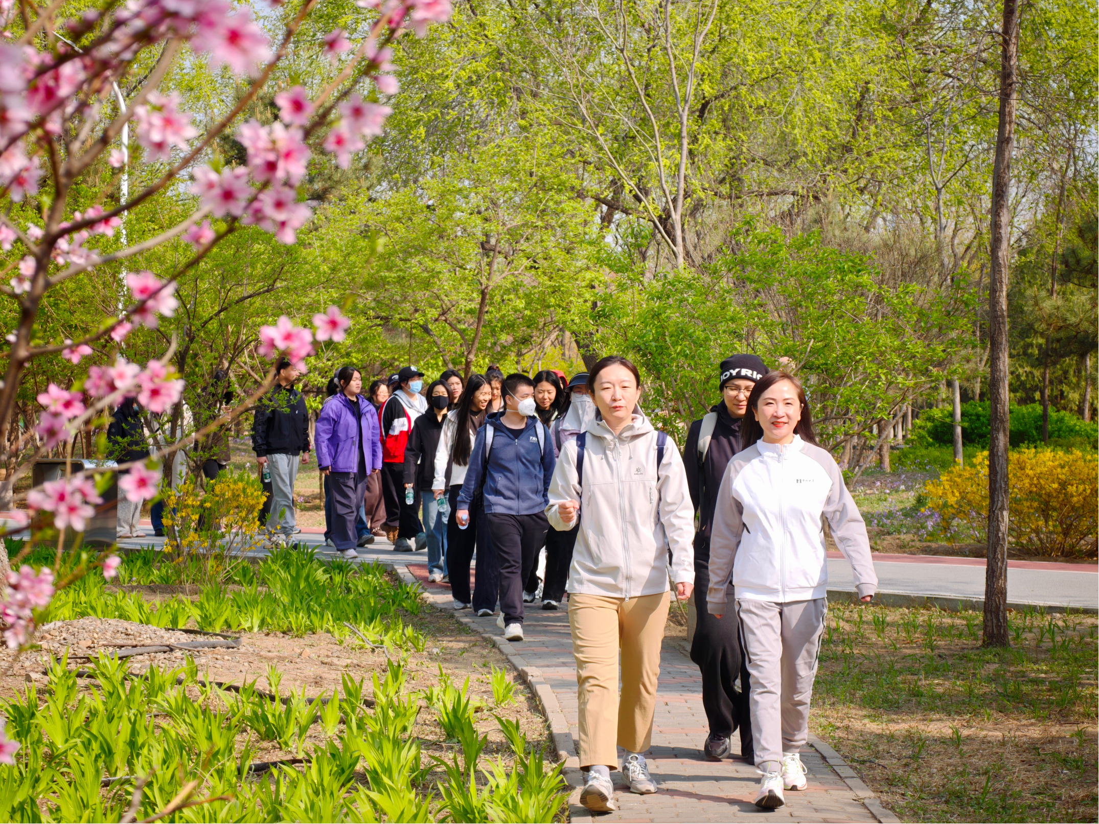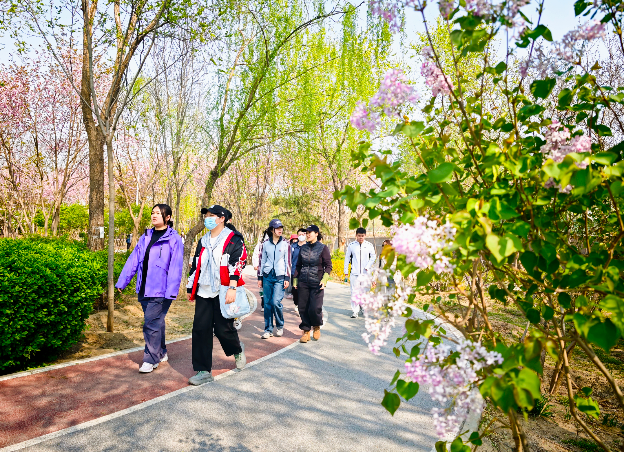 他们徒步的路线,正是丰台区重点打造的生态文旅名片——全长13.08公里的永定河绿道。本次活动选取绿堤公园至宛平湖段约3公里精华路线,彩色骑行道蜿蜒向前,串联起绿堤郊野公园、紫谷伊甸园等生态节点。青年们在三位榜样的带领下徒步而行,沿途观鸟栈道临水而立,四季花海次第绽放,与京雄大桥的现代景致相映成趣。