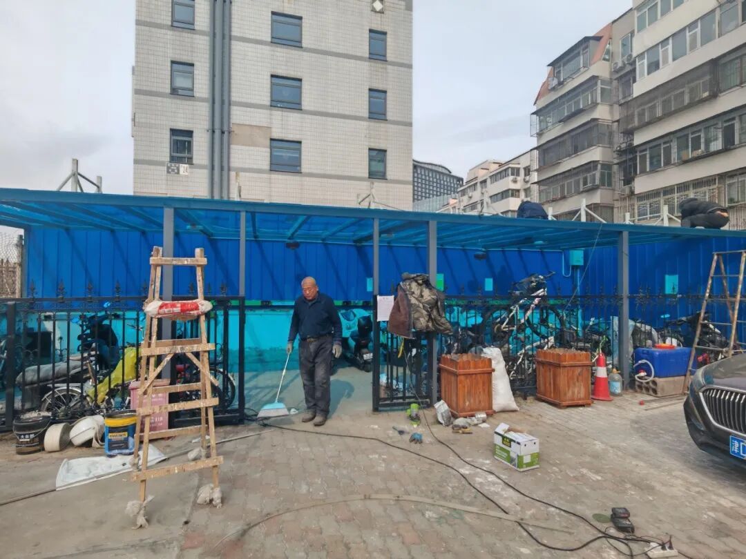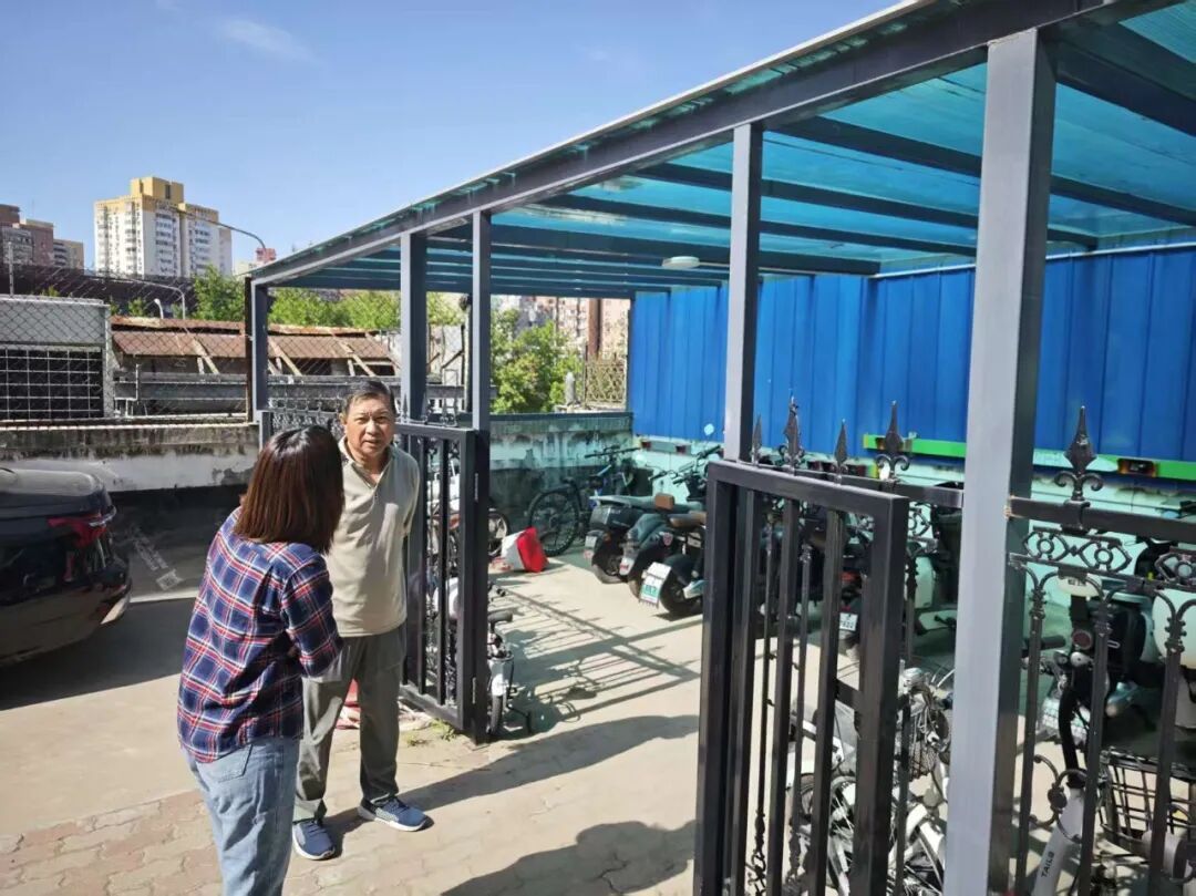 另一边,西坝河北里23号楼的居民曾有个烦心事:车棚漏雨。顶棚老化破损,积尘脏污,一到雨天,爱车跟着“淋浴”,居民心疼又无奈。