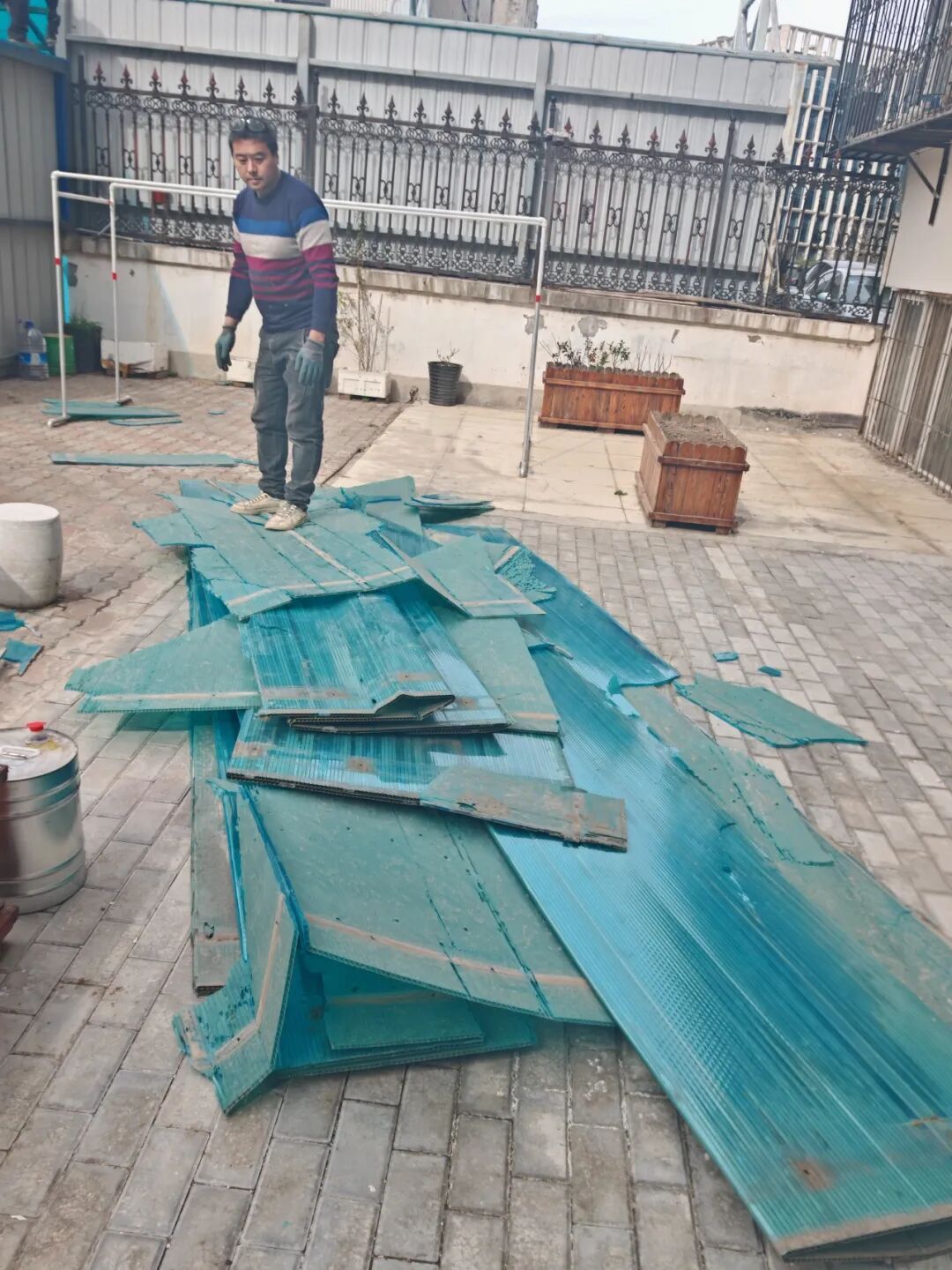 接到居民反馈后,社区工作人员立即前往现场核实,确认顶棚多处开裂、锈蚀,部分区域已失去防水功能。社区随即召开专题碰头会,邀请楼门长和居民代表一起商量:选什么材质的顶棚?既要耐用防雨,又要透光、美观。经过比选,最终确定采用高强度聚碳酸酯板材,抗老化、抗冲击,且外观整洁明亮。敲定方案后,施工方紧锣密鼓地拆除旧顶棚、对骨架进行除锈加固、安装新板材……整个工程仅用1天就全部完成。