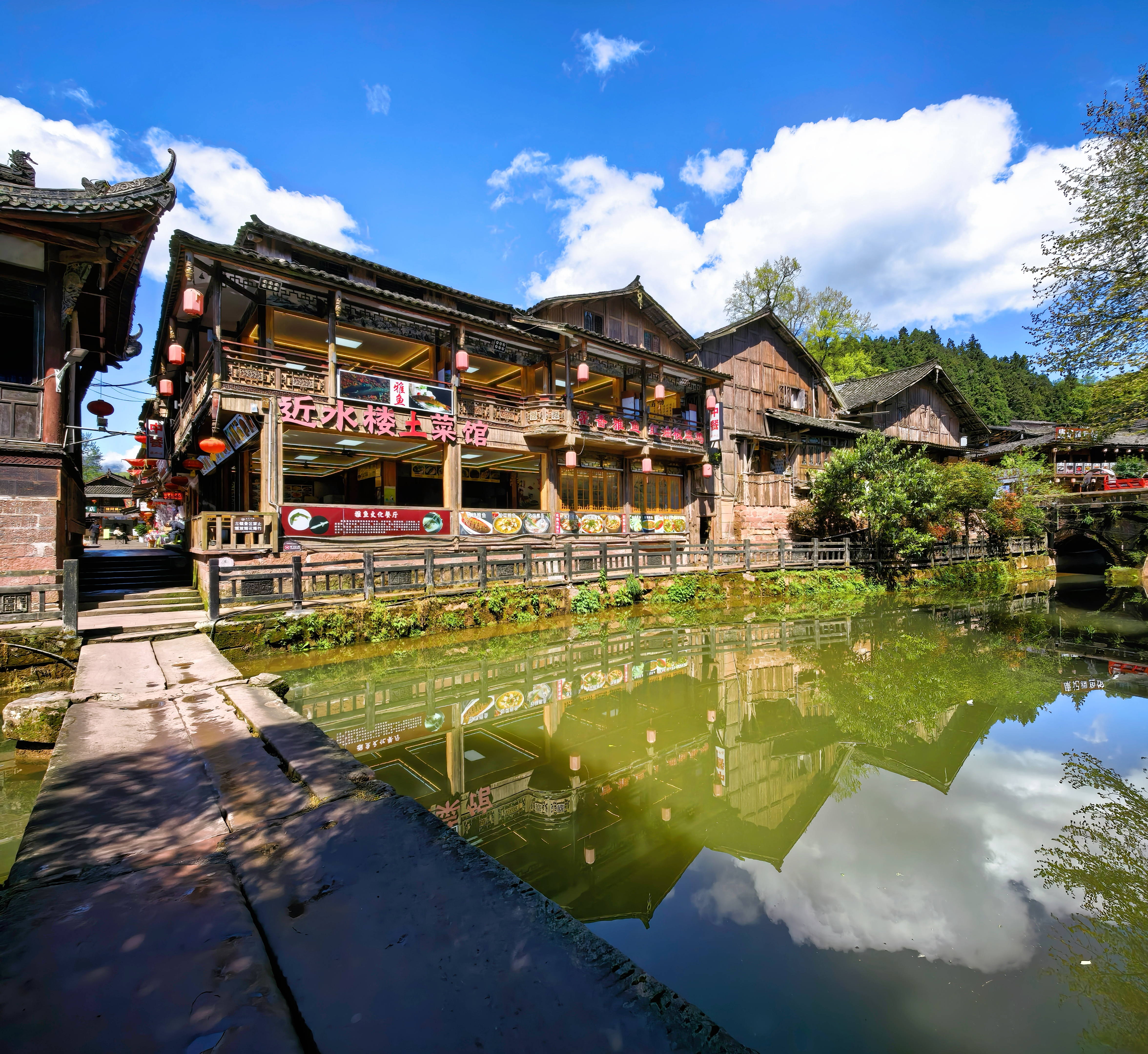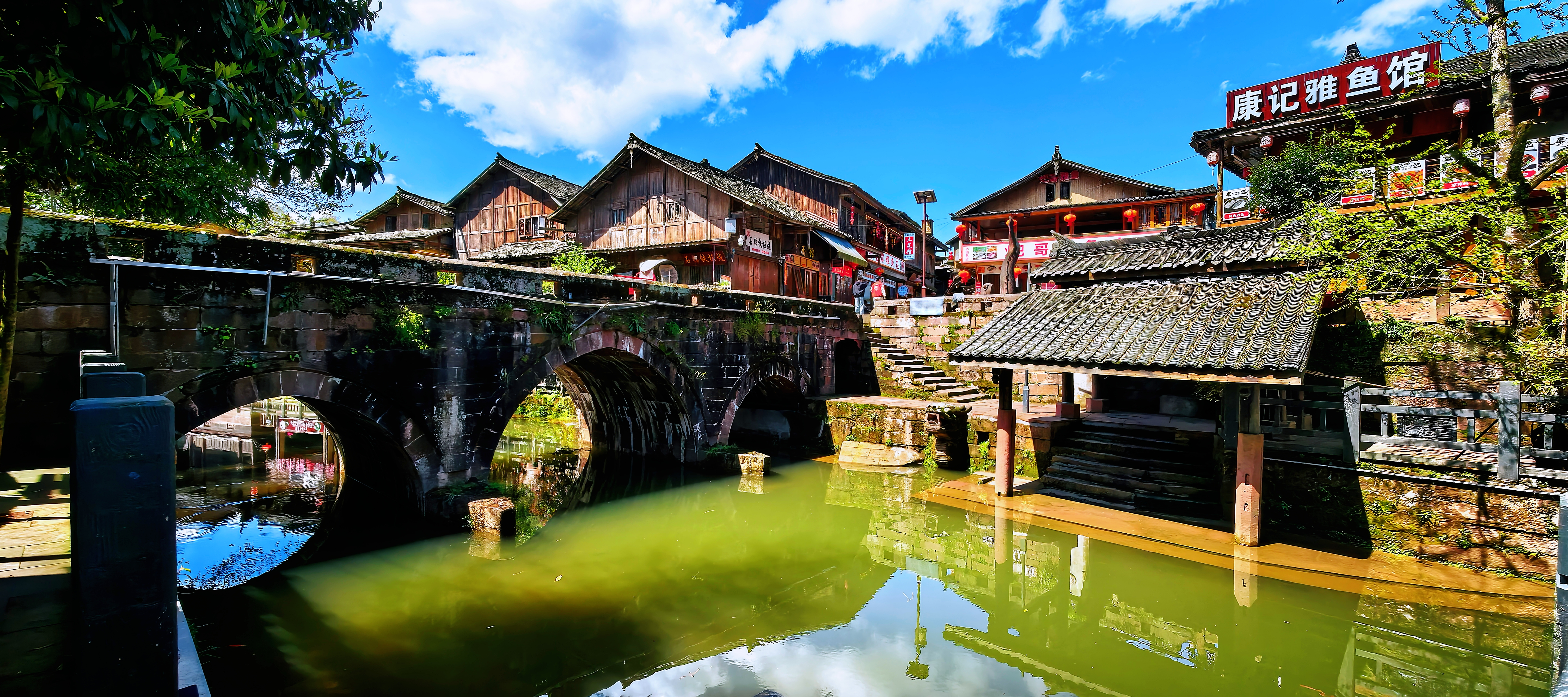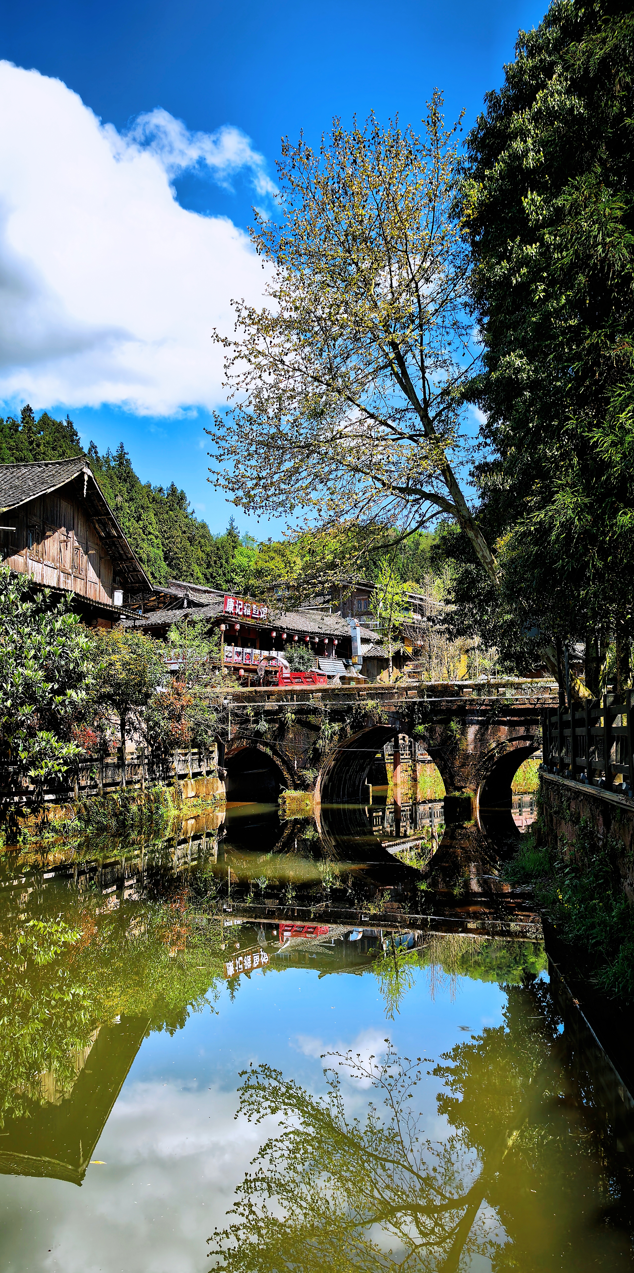 如今,乾隆年间建成的二仙桥倒影依旧,传说建桥时两位仙人相助,桥身如月弧卧波,与流水相映成趣;溪边吊脚楼炊烟袅袅,没有喧嚣商业,只有时光静谧流淌。