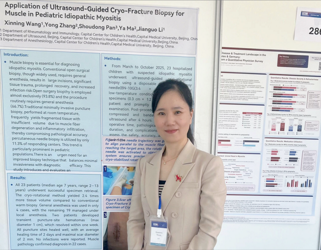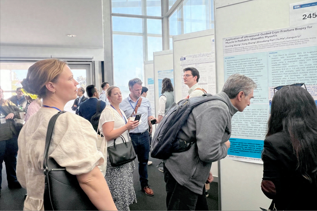 在壁报交流环节,展示了风湿免疫科2病区与超声科联手开创的“冰冻旋切活检技术”在幼年皮肌炎中的应用,引发了国际同行的热烈关注和讨论。